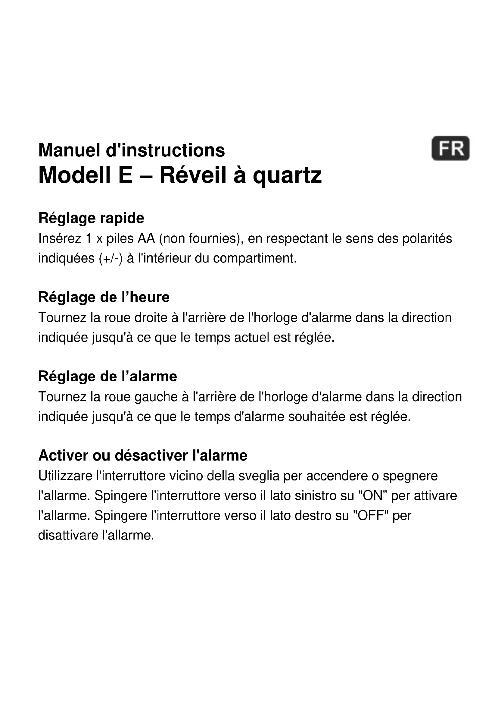 | Fonctionnalités | Réveil avec radio FM, alarme progressive, snooze |