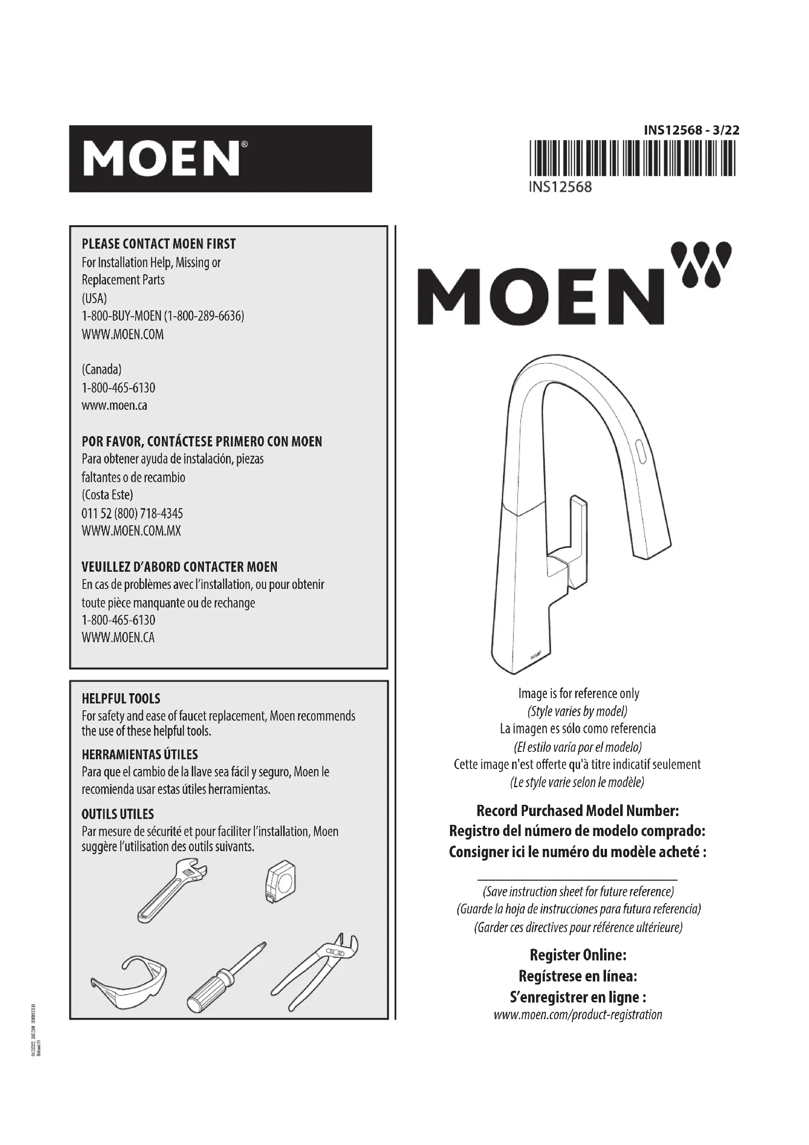 VOTRE HAUTPARLEUR INTELLIGENT : The Moen Smart Water App is required toconnect your Moen Smart Faucet to your Wi-Fi network and Smart Speaker. The App guides you through all necessary steps to ensure that you are properly connected and have enabled Moen’s smart skill. Both are required to initiate the product's voice activation and full App features. Se requiere la aplicación Smart Water de Moenpara conectar su llave inteligente a su red WiFiy a su bocina inteligente. La aplicación lo guiarápor los pasos necesarios para asegurarse de queesté conectado correctamente y que tengaactivada las capacidades de Moen. Ambos son necesarios para iniciar la activaciónpor voz del producto y todas las funciones de laaplicación. Vous aurez besoin de l’appli du réseau d’eauintelligent de Moen pour connecter votre robinetintelligent Moen à votre réseau Wi-Fi et à votrehaut-parleur intelligent. Cette appli vous guideratout au long des étapes nécessaires pour assurerune connexion adéquate à votre réseau Wi-Fi etl’activation de la « caractéristique intelligente »de Moen. Ces deux éléments sont requis pouramorcer la fonctionnalité de commande vocale duproduit, de même que l’ensemble desfonctionnalités de l’appli. LEARN MORE: To learn more about the Moen Smart Water App, supported voice commands, customizable settings, modes and other topics visit: https://www.moen.com/customer- support/faq#/cat-smartfaucet MÁS INFORMACIÓN: Para obtener más información sobre la aplicación Smart Water de Moen, los comandos de voz admitidos, las cong raciones personalizables, los modos y otros temas, visite: https://www.moen.com/customer- support/faq#/cat-smartfaucet POUR EN APPRENDRE DAVANTAGE : Pour en apprendre davantage sur l’appli duréseau d’eau intelligent de Moen, les commandesvocales prises en charge, les paramètrespersonnalisables et les diérents modes, de mêmeque sur d’autres sujets, veuillez consulter la pagesuivante :https://www.moen.com/customer-support/faq#/cat-smartfaucet