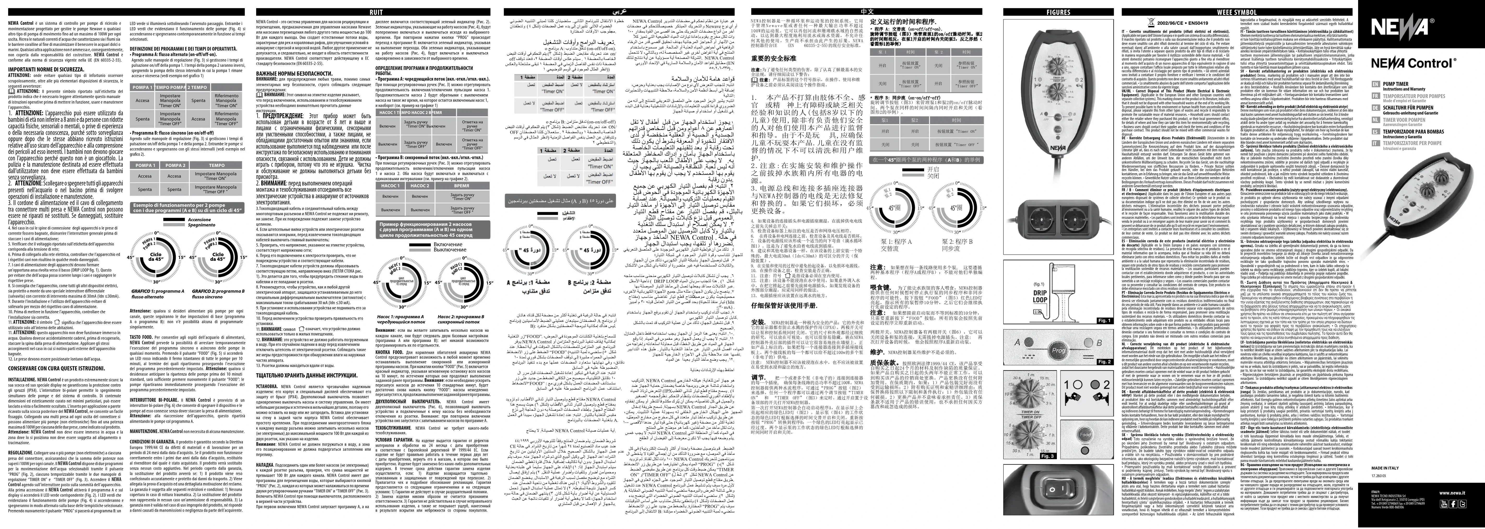 devait tomber accidentellement dans l’eau, débrancher la fiche de la prise de courant avant de le récupérer. Prendre les mêmes précautions si la partie externe de l’appareil est mouillée.13. Les prises doivent être placées loin de l’eau. CONSERVER SOIGNEUSEMENT CETTE NOTICE. INSTALLATION. NEWA Control est un appareil extrêmement sûr: sa coque et son afficheur spécial en garantissent la protection contre les éclaboussures (IPX4). L’interrupteur bipolaire permet d’éteindre simultanément les pompes et le système de contrôle. De dimensions contenues et soigné esthétiquement dans les moindres détails, il peut rester apparent ou être dissimulé sans problèmes. L’élément pour l’application murale obtenu sur la coque arrière du NEWA Control permet de le fixer facilement. En branchant une multiprise à chaque sortie du connecteur, il est possible d’alimenter plusieurs pompes (non électroniques) jusqu’à une puissance maximale de 100 W pour chacune des deux prises, comme indiqué sur l’appareil. Attention: Ne pas plonger NEWA Control dans l’eau et s’assurer que l’eau ne peut pas mouiller la zone où il est positionné (débordement).RÉGLAGE. Brancher une ou plusieurs pompes (non électroniques) à chaque prise du connecteur, en s’assurant que la somme des puissances ne dépasse pas les 100 W pour chaque canal. NEWA Control dispose de deux programmes pour le brassage de l’eau à sélectionner avec le bouton PROG (Fig. 2), chacun pouvant être temporisé à l’aide des deux boutons de réglage TIMER ON et TIMER OFF (Fig. 3). Allumer NEWA Control en agissant sur l’interrupteur situé en haut de l’appareil. Au premier allumage, NEWA Control active le programme A et le voyant vert correspondant s’allume sur l’afficheur (Fig. 2).Les voyants verts qui indiquent le fonctionnement des pompes (Fig. 4) s’allument et s’éteignent en mode alterné selon le temps sélectionné. Le fait d’appuyer de nouveau sur le bouton PROG permet de passer au programme B: un voyant vert s’allume pour indiquer que le passage a eu lieu. Les deux voyants verts qui indiquent le fonctionnement des pompes (Fig. 4) s’allument ou s’éteignent en même temps en fonction du temps sélectionné. DÉFINITION DES PROGRAMMES ET DES TEMPS DE FONCTIONNEMENT.