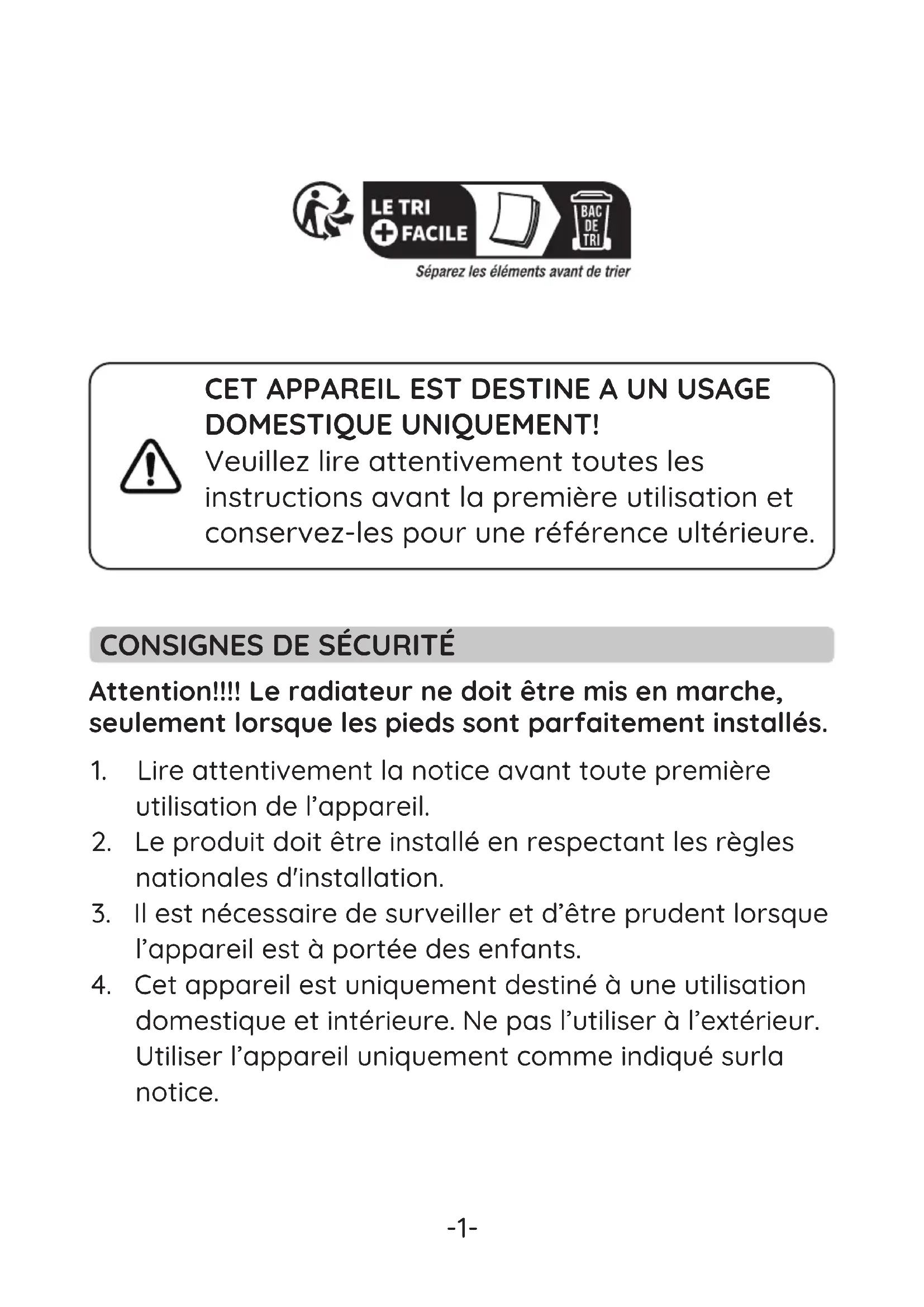 -13--1- CET APPAREIL EST DESTINE A UN USAGE DOMESTIQUE UNIQUEMENT! Veuillez lire attentivement toutes les instructions avant la première utilisation et conservez-les pour une référence ultérieure. Attention!!!! Le radiateur ne doit être mis en marche, seulement lorsque les pieds sont parfaitement installés.