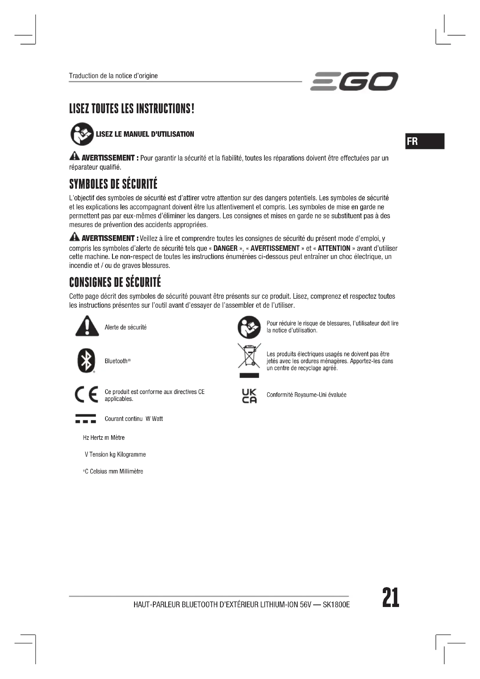 Cette page décrit des symboles de sécurité pouvant être présents sur ce produit. Lisez, comprenez et respectez toutes les instructions présentes sur l’outil avant d’essayer de l’assembler et de l’utiliser. Alerte de sécuritéPour réduire le risque de blessures, l’utilisateur doit lire la notice d’utilisation.Bluetooth Les produits électriques usagés ne doivent pas être jetés avec les ordures ménagères. Apportez-les dans un centre de recyclage agréé.Ce produit est conforme aux directives CE applicables.Conformité Royaume-Uni évaluéeCourant continu W Watt Hz Hertz m MètreV Tension kg Kilogramme C Celsius mm Millimètre Traduction de la notice d’origine22