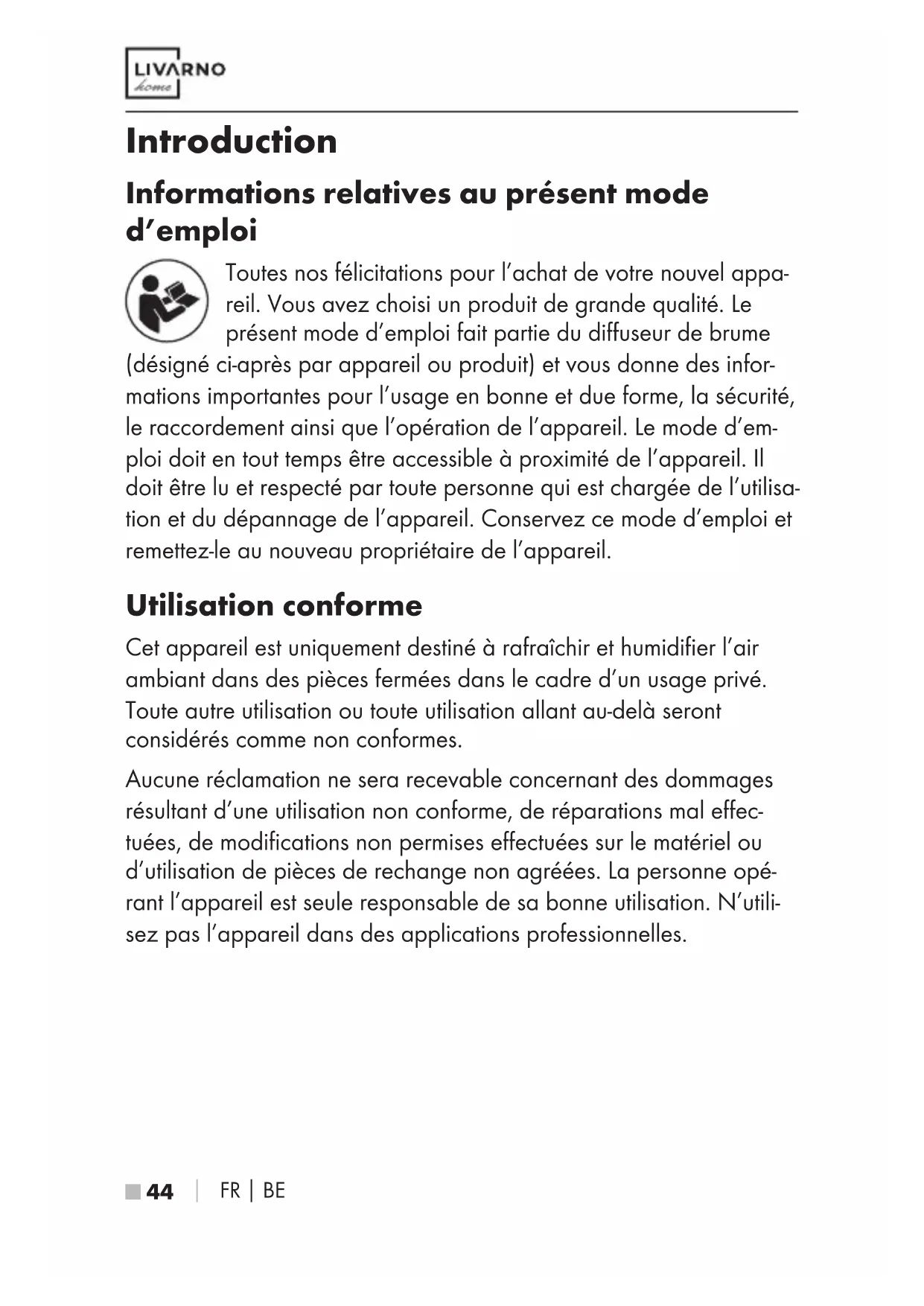 Introduction Informations relatives au présent mode d’emploi Toutes nos félicitations pour l’achat de votre nouvel appa- reil. Vous avez choisi un produit de grande qualité. Le présent mode d’emploi fait partie du diffuseur de brume (désigné ci-après par appareil ou produit) et vous donne des infor- mations importantes pour l’usage en bonne et due forme, la sécurité, le raccordement ainsi que l’opération de l’appareil. Le mode d’em- ploi doit en tout temps être accessible à proximité de l’appareil. Il doit être lu et respecté par toute personne qui est chargée de l’utilisa- tion et du dépannage de l’appareil. Conservez ce mode d’emploi et remettez-le au nouveau propriétaire de l’appareil. Utilisation conforme Cet appareil est uniquement destiné à rafraîchir et humidifier l’air ambiant dans des pièces fermées dans le cadre d’un usage privé. Toute autre utilisation ou toute utilisation allant au-delà seront considérés comme non conformes. Aucune réclamation ne sera recevable concernant des dommages résultant d’une utilisation non conforme, de réparations mal effec- tuées, de modifications non permises effectuées sur le matériel ou d’utilisation de pièces de rechange non agréées. La personne opé- rant l’appareil est seule responsable de sa bonne utilisation. N’utili- sez pas l’appareil dans des applications professionnelles. IB_481062_2410_LADG12A1_LADV12A1_LB8.indb 44 14.03.2025 10:49:48FR