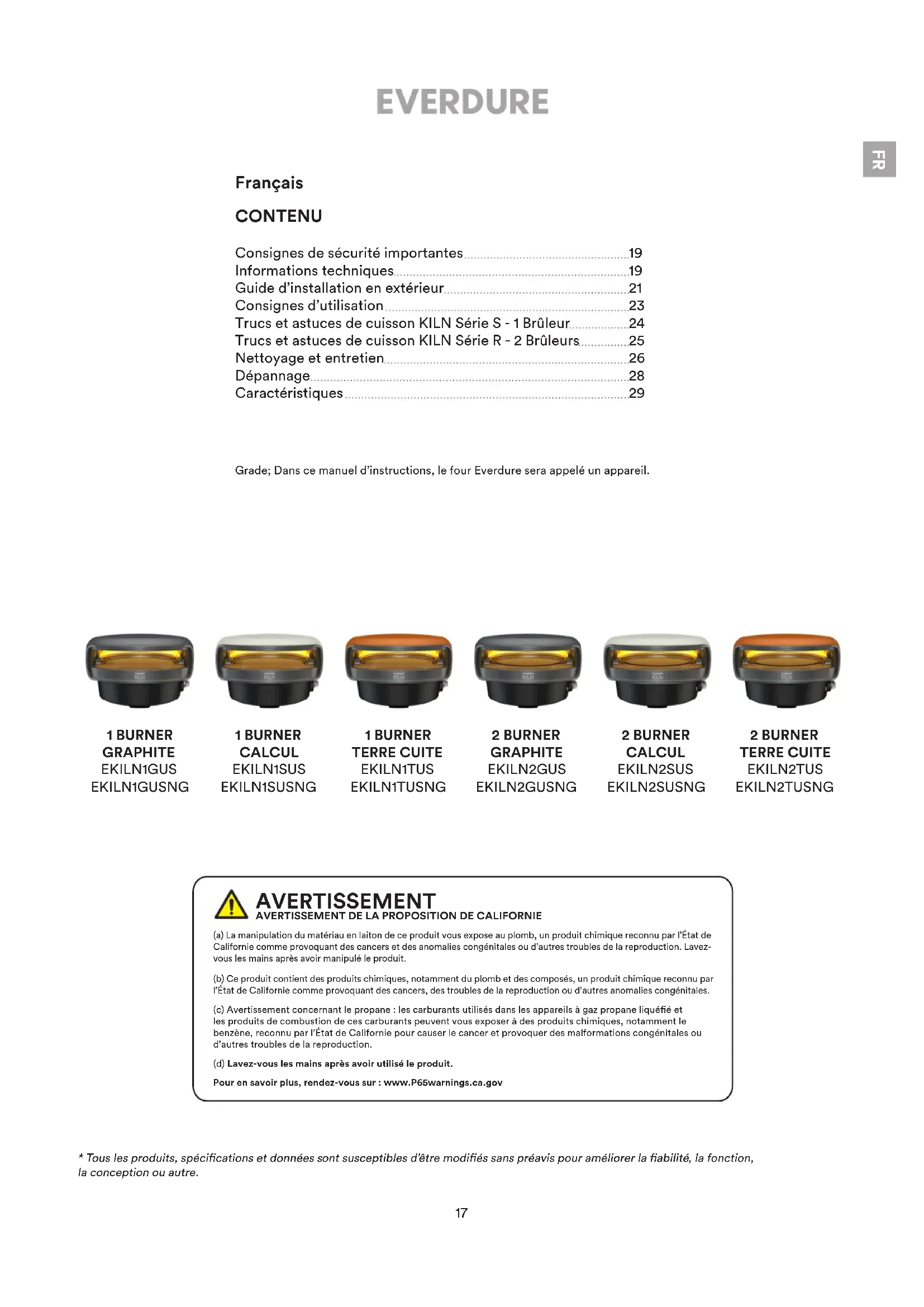 Grade; Dans ce manuel d’instructions, le four Everdure sera appelé un appareil. (a) La manipulation du matériau en laiton de ce produit vous expose au plomb, un produit chimique reconnu par l’État de Californie comme provoquant des cancers et des anomalies congénitales ou d’autres troubles de la reproduction. Lavez-vous les mains après avoir manipulé le produit.(b) Ce produit contient des produits chimiques, notamment du plomb et des composés, un produit chimique reconnu par l’État de Californie comme provoquant des cancers, des troubles de la reproduction ou d’autres anomalies congénitales.(c) Avertissement concernant le propane : les carburants utilisés dans les appareils à gaz propane liquéé et les produits de combustion de ces carburants peuvent vous exposer à des produits chimiques, notamment le benzène, reconnu par l’État de Californie pour causer le cancer et provoquer des malformations congénitales ou d’autres troubles de la reproduction.(d) Lavez-vous les mains après avoir utilisé le produit.Pour en savoir plus, rendez-vous sur : www.P65warnings.ca.gov AVERTISSEMENT
