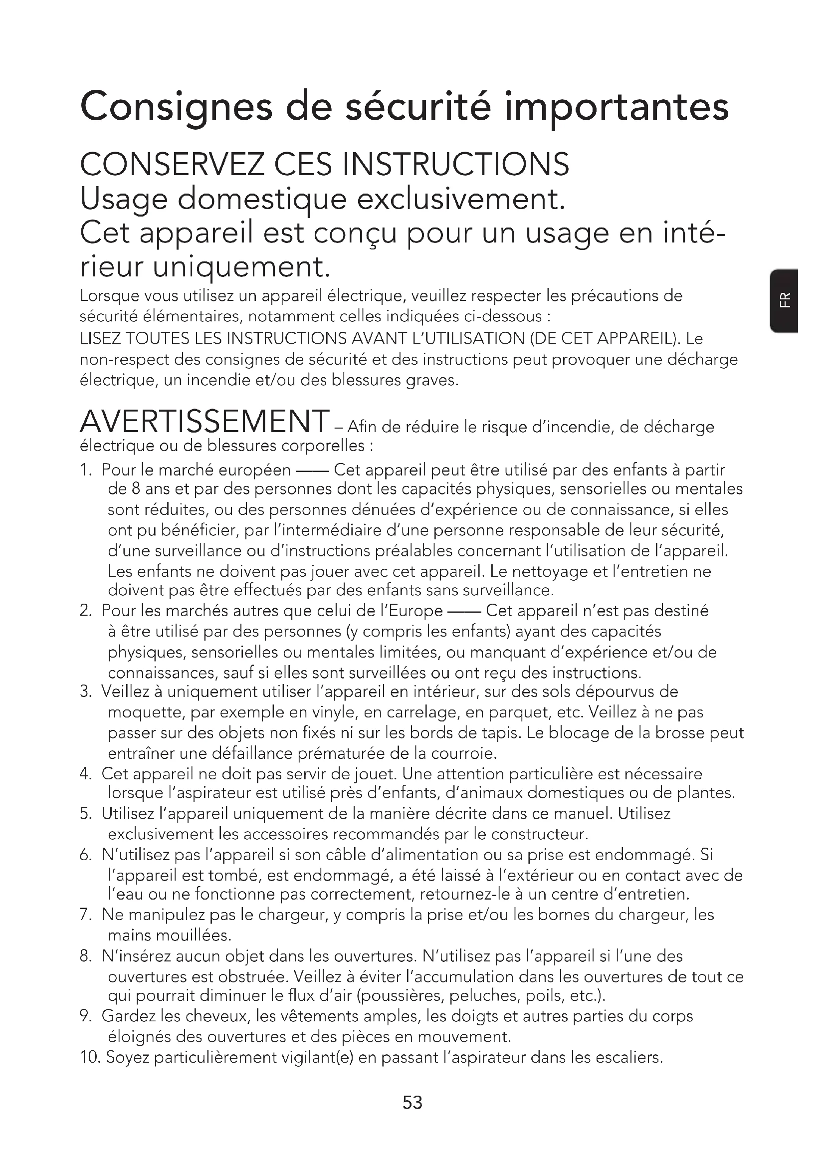 Usage domestique exclusivement. Cet appareil est conçu pour un usage en inté- rieur uniquement. Lorsque vous utilisez un appareil électrique, veuillez respecter les précautions de sécurité élémentaires, notamment celles indiquées ci-dessous: LISEZ TOUTES LES INSTRUCTIONS AVANT L’UTILISATION (DE CET APPAREIL). Le non-respect des consignes de sécurité et des instructions peut provoquer une décharge électrique, un incendie et/ou des blessures graves. AVERTISSEMENT – An de réduire le risque d’incendie, de décharge électrique ou de blessures corporelles: