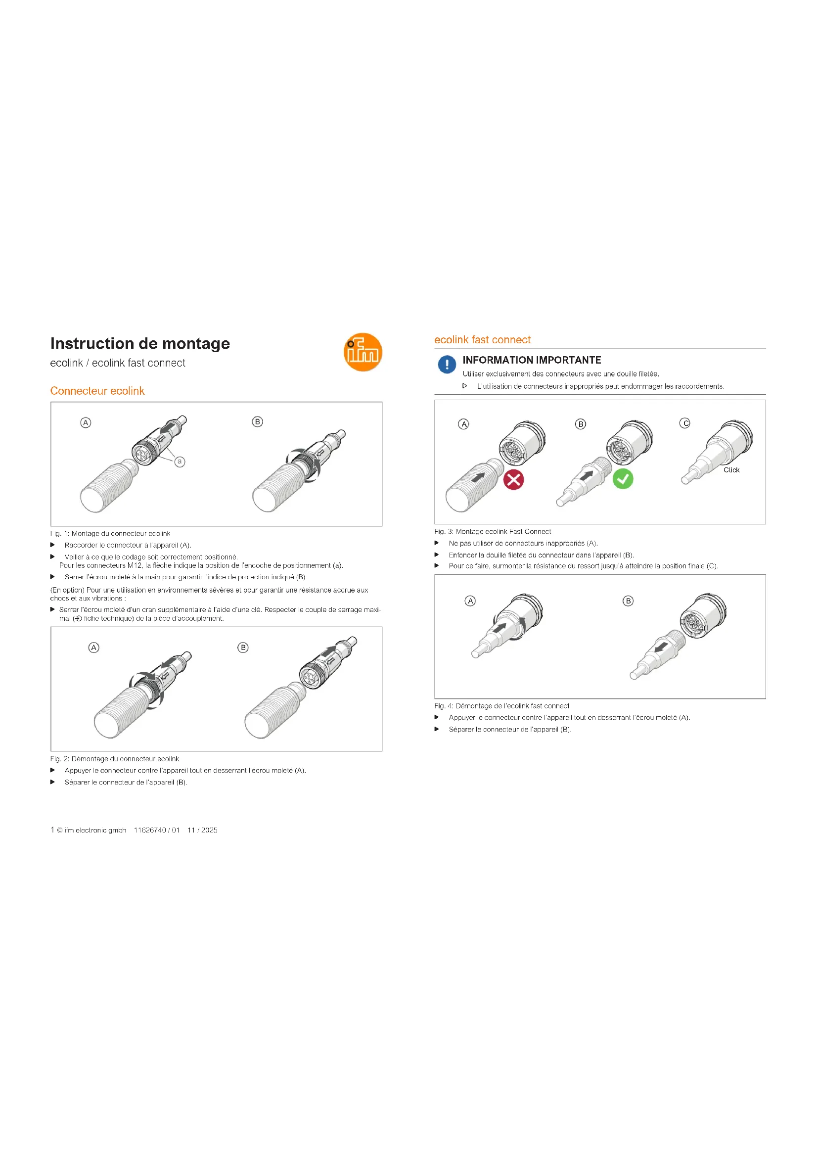 Fig.1: Montage du connecteur ecolink Raccorder le connecteur à l’appareil (A). Veiller à ce que le codage soit correctement positionné.Pour les connecteurs M12, la flèche indique la position de l’encoche de positionnement (a). Serrer l’écrou moleté à la main pour garantir l’indice de protection indiqué (B).(En option) Pour une utilisation en environnements sévères et pour garantir une résistance accrue auxchocs et aux vibrations : Serrer l’écrou moleté d’un cran supplémentaire à l’aide d’une clé. Respecter le couple de serrage maxi- mal ( fiche technique) de la pièce d’accouplement.