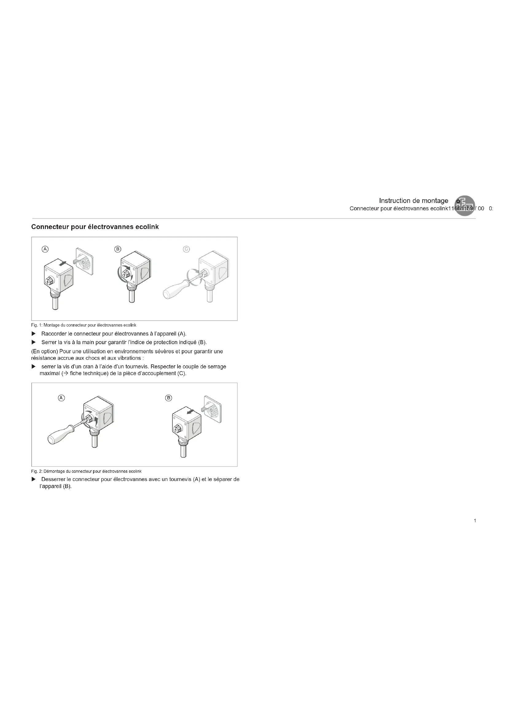 Fig.1: Montage du connecteur pour électrovannes ecolink u Raccorder le connecteur pour électrovannes à l’appareil (A). u Serrer la vis à la main pour garantir l’indice de protection indiqué (B). (En option) Pour une utilisation en environnements sévères et pour garantir une résistance accrue aux chocs et aux vibrations : u serrer la vis d’un cran à l’aide d’un tournevis. Respecter le couple de serrage maximal (Ò fiche technique) de la pièce d’accouplement (C).