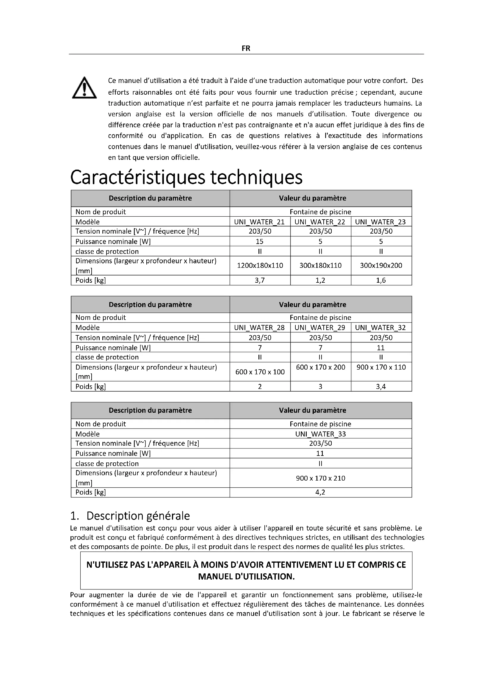 ATTENTION! Lire tous les avertissements de sécurité et toutes les instructions. Le non-respect des avertissements et des instructions peut entraîner un choc électrique, un incendie et/ou des blessures graves, voire la mort. Le terme "dispositif" ou "produit" dans les avertissements et dans la description du manuel fait référence à l'intitulé suivant: Fontaine de piscine 2.1. Sécurité électrique S'applique à l'alimentation a) La fiche doit s'adapter à la prise. Ne pas modifier la fiche de quelque manière que ce soit. L'utilisation de fiches d'origine et de prises adaptées réduit le risque de choc électrique. b) Ne pas toucher à l’appareil avec des mains mouillées ou humides. c) Utilisez le câble uniquement pour l'usage prévu. Ne l'utilisez jamais pour transporter l'appareil ou pour débrancher la fiche d'une prise. Gardez le câble éloigné des sources de chaleur, de l'huile, des arêtes vives ou des pièces mobiles. Les câbles endommagés ou emmêlés augmentent le risque de choc électrique. d) Si vous travaillez avec l'appareil à l'extérieur, veillez à utiliser une rallonge adaptée à une utilisation en extérieur. L'utilisation d'une rallonge adaptée à une utilisation en extérieur réduit le risque de choc électrique. e) Si l'utilisation de l'appareil dans un environnement humide ne peut être évitée, un dispositif à courant résiduel (RCD) doit être appliqué. L'utilisation d'un RCD réduit le risque de choc électrique. 2.2. Sécurité au travail a) Assurez-vous que le lieu de travail est propre et bien éclairé. Un lieu de travail en désordre ou mal éclairé peut entraîner des accidents. Essayez d'anticiper, d'observer ce qui se passe et de faire preuve de bon sens lorsque vous travaillez avec l'appareil. b) Si vous constatez des dommages ou un fonctionnement irrégulier, éteignez immédiatement l'appareil et signalez-le sans délai à un superviseur. c) En cas de doute sur le bon fonctionnement de l'appareil, contactez le service d'assistance du fabricant.FR d) Seul le point de service du fabricant est autorisé à réparer l'appareil. Ne tentez aucune réparation par vous-même ! e) En cas d'incendie, utilisez un extincteur à poudre ou à dioxyde de carbone (CO2) (destiné à être utilisé sur des appareils électriques sous tension) pour l'éteindre. f) Inspectez régulièrement l’état des étiquettes de sécurité. Si les étiquettes sont illisibles, elles doivent être remplacées. g) Veuillez conserver ce manuel à disposition pour référence future. Si cet appareil est transmis à un tiers, le manuel doit être transmis avec lui.