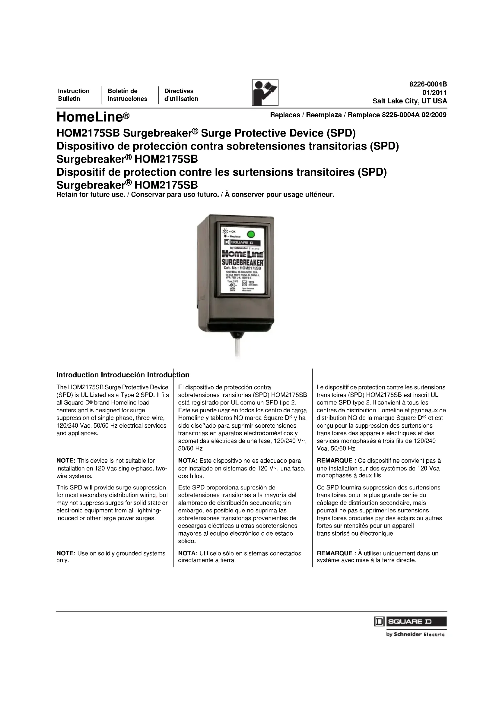Le dispositif de protection contre les surtensions transitoires (SPD) HOM2175SB est inscrit UL comme SPD type 2. Il convient à tous les centres de distribution Homeline et panneaux de distribution NQ de la marque Square D® et est conçu pour la suppression des surtensions transitoires des appareils électriques et des services monophasés à trois fils de 120/240 Vca, 50/60 Hz.