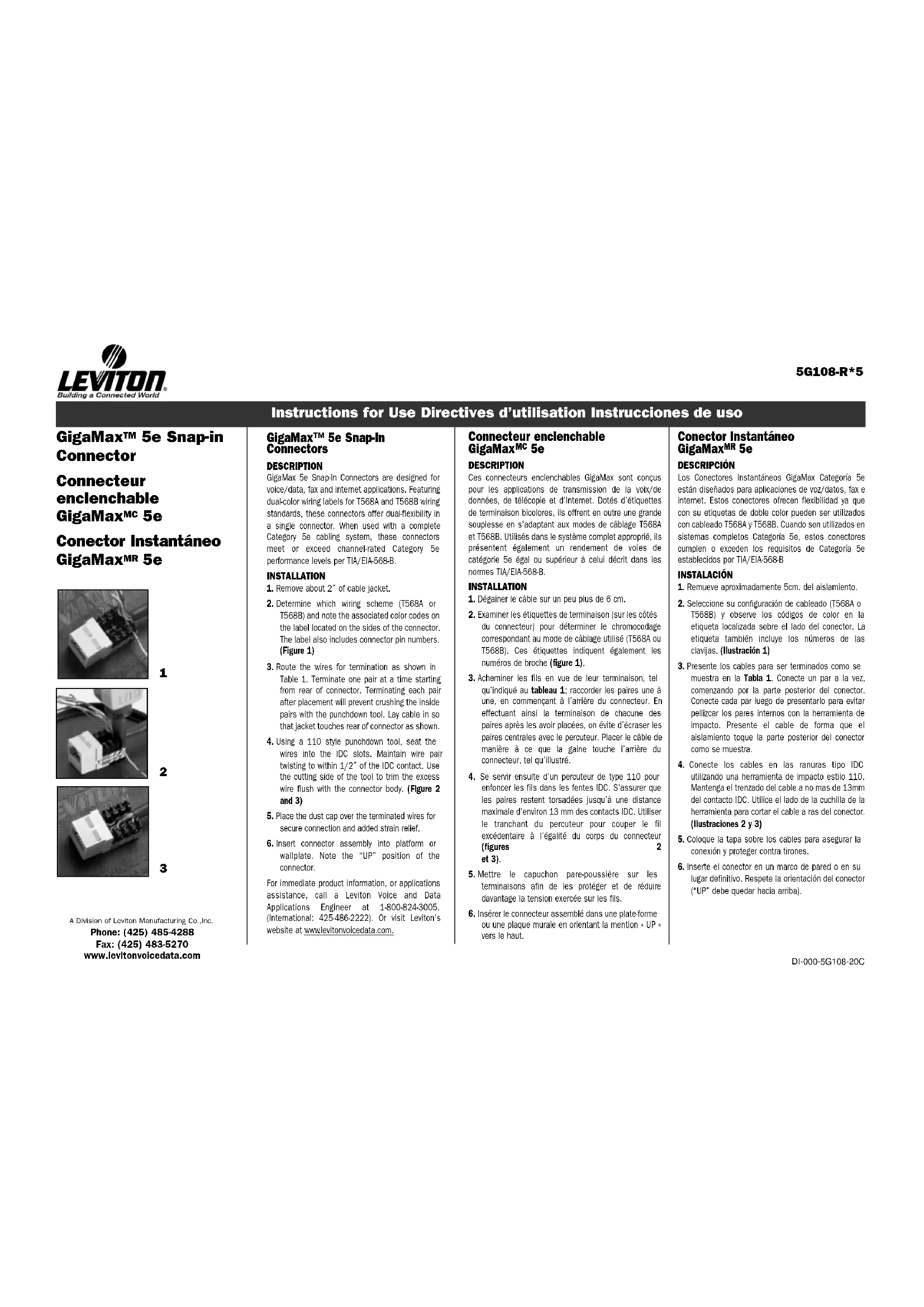 T568A Y T568B TABLA 1 T568A Blanc/Vert2 Vert ou Vert/Blanc Blanc/Orange4 Bleu ou Bleu/Blanc Blanc/Bleu6 Orange ou Orange/Blanc Blanc/Brun8 Brun ou Brun/BlancT568B Blanc/Orange2 Orange ou Orange/Blanc Blanc/Vert4 Bleu ou Bleu/Blanc Blanc/Bleu6 Vert ou Vert/Blanc7 Blanc//Brun8 Brun ou Brun/Blanc MODES DE CÂBLAGE T568A ET T568B TABLEAU 1 Pour obtenir de l’information immédiate sur les produits ou de l’aide concernant leurs applications, communiquez avec les ingénieurs de Leviton en composant le 1-800-824- 3005 [(425) 486-2222 à l’international] ou rendez-vous au site www .levitonvoicedata.com.