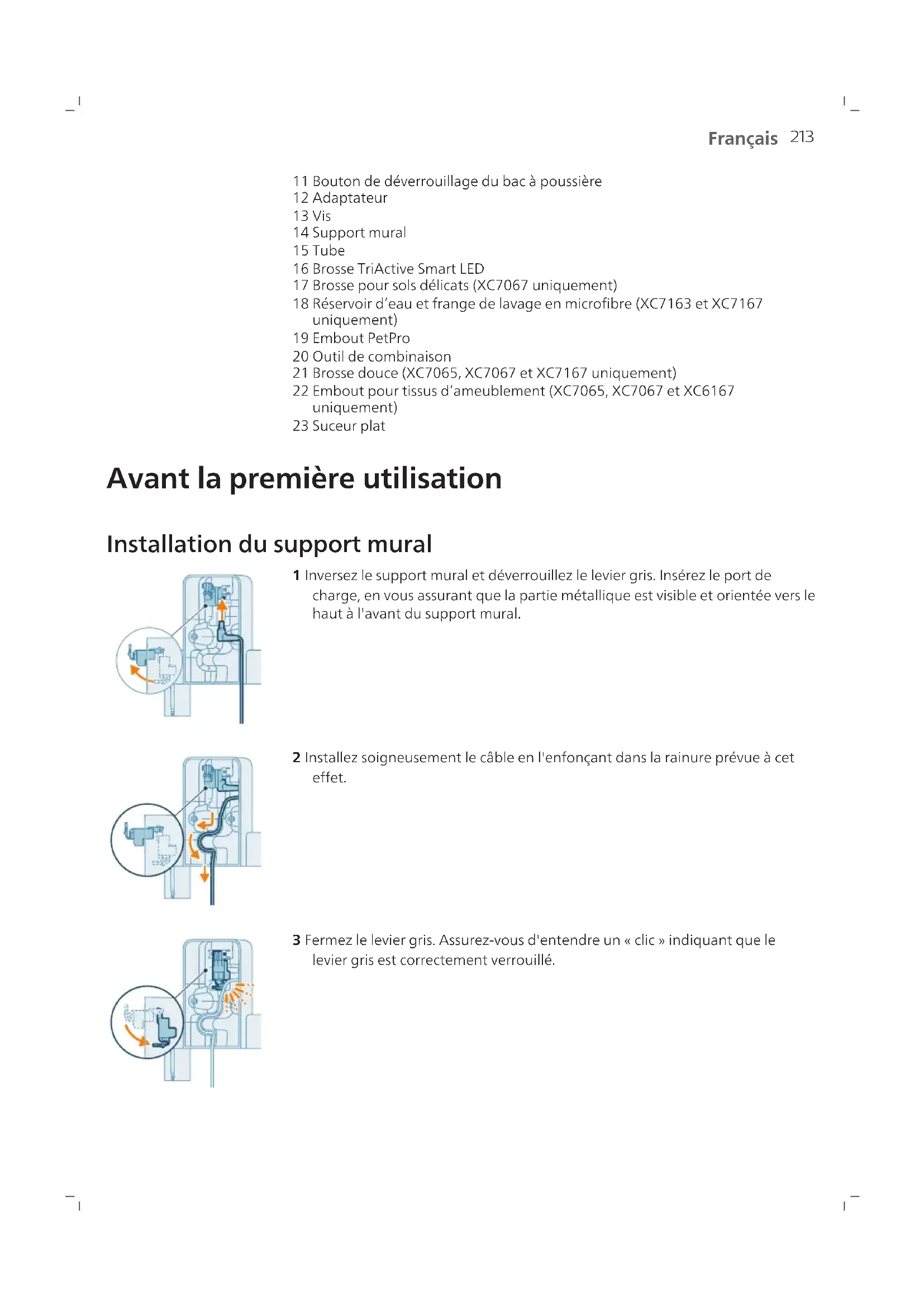 Français Français Table des matières Introduction ______________________________________________________________________________ 212 Description générale ______________________________________________________________________ 212 Avant la première utilisation _______________________________________________________________ 213 Installation du support mural_____________________________________________________________ 213 Rangement des accessoires sur le support mural ____________________________________________ 214 Avant utilisation __________________________________________________________________________ 215 Utilisation de l’appareil ____________________________________________________________________ 216 Assemblage de l'appareil ________________________________________________________________ 216 Aspiration des sols mous et durs __________________________________________________________ 216 Aspiration et nettoyage des sols durs______________________________________________________ 217 Usage polyvalent et accessoires___________________________________________________________ 220 Personnalisations et informations supplémentaires _________________________________________ 224 Après utilisation - Entretien ________________________________________________________________ 226 Entretien fréquent après chaque cycle de nettoyage ________________________________________ 226 Entretien périodique intermittent_________________________________________________________ 229 Remplacement ____________________________________________________________________________ 238 Signification des voyants de l’interface utilisateur ___________________________________________ 239 Dépannage _______________________________________________________________________________ 241 Nettoyage à sec ________________________________________________________________________ 241 Nettoyage humide______________________________________________________________________ 245 Introduction Merci d’avoir acheté ce produit! Pour bénéficier pleinement de l’assistance que nous proposons, enregistrez votre produit sur le site www.philips.com/mycordlessvacuum-7000s. Description générale 1 Afficheur numérique a Anneau indicateur de niveau de charge de la batterie b Pourcentage de charge de la batterie c Niveau de puissance sélectionné d Icône «Fonction de reconnaissance du type de sol activée» e Icône de rappel de nettoyage du filtre 2 Bouton Menu/Confirmer 3 Bouton + 4 Bouton - 5 Bouton marche/arrêt 6 Aspirateur àmain 7 Bac àpoussière 8 Pile 9 Filtre de rechange 10 Bouton de vidange facile213 Français 11 Bouton de déverrouillage du bac àpoussière 12 Adaptateur 13 Vis 14 Support mural 15 Tube 16 Brosse TriActive Smart LED 17 Brosse pour sols délicats (XC7067 uniquement) 18 Réservoir d’eau et frange de lavage en microfibre (XC7163 et XC7167 uniquement) 19 Embout PetPro 20 Outil de combinaison 21 Brosse douce (XC7065, XC7067 et XC7167 uniquement) 22 Embout pour tissus d’ameublement (XC7065, XC7067 et XC6167 uniquement) 23 Suceur plat Avant la première utilisation Installation du support mural 1 Inversez le support mural et déverrouillez le levier gris. Insérez le port de charge, en vous assurant que la partie métallique est visible et orientée vers le haut à l'avant du support mural. 2 Installez soigneusement le câble en l'enfonçant dans la rainure prévue à cet effet. 3 Fermez le levier gris. Assurez-vous d'entendre un «clic» indiquant que le levier gris est correctement verrouillé.214 Français 110 ± 2 cm 4 Fixez bien le support mural à l'endroit de votre choix sur le mur, en vous assurant que les trous de vis de montage se trouvent à environ 110cm du sol. Attention: soyez prudent lorsque vous percez des trous dans le mur pour fixer le support mural, afin d’éviter tout risque d’électrocution. Remarque: Vérifiez que le positionnement du support mural permet à tout l'appareil de pendre le long du mur sans que l'embout entre en contact avec le sol. 5 Après avoir défini la position et la hauteur optimales de rangement et de chargement de votre appareil, serrez bien les vis pour une fixation optimale du support mural. Rangement des accessoires sur le support mural Tous les accessoires peuvent être rangés sur le support mural, à l’exception de l’embout PetPro et de l’outil pour tissus d’ameublement ensemble. Remarque: Notez que l’embout PetPro et l’outil pour tissus d’ameublement ne peuvent pas être rangés ensemble sur le support mural.215 Français Avant utilisation L’appareil est équipé d’une batterie Li-Ion. Avec la batterie entièrement déchargée, le chargement dure environ 6heures. 1 Fixez la batterie au châssis de l'appareil, en vous assurant d'entendre un «clic» confirmant la bonne connexion des deux éléments.