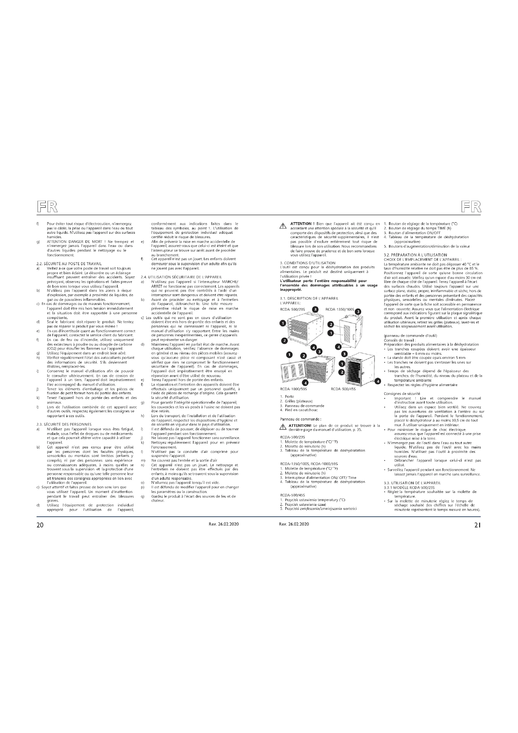 Rev. 26.02.2020 Respectez les consignes du manuel. Collecte séparée. ATTENTION ! , AVERTISSEMENT ! et REMARQUE attirent l’attention sur des circonstances spéciques (symboles d’avertissement généraux). Portez des protections pour les mains. ATTENTION ! Mise en garde liée à la tension électrique ! ATTENTION ! Surfaces chaudes. Risque de brûlures ! Pour l’utilisation intérieure uniquement. Les notions d‘« appareil », de « machine » et de « produit » gurant dans les descriptions et les consignes du manuel se rapportent à/au DESHYDRATEUR ALIMENTAIRE. N‘utilisez pas l‘appareil dans des pièces où le taux d‘humidité est très élevé, ni à proximité immédiate de récipients d‘eau ! Ne mouillez pas l‘appareil. Risque de chocs électriques ! Ne couvrez pas les entrée et les sorties d‘air ! Ne couvrez pas les orices de ventilation !