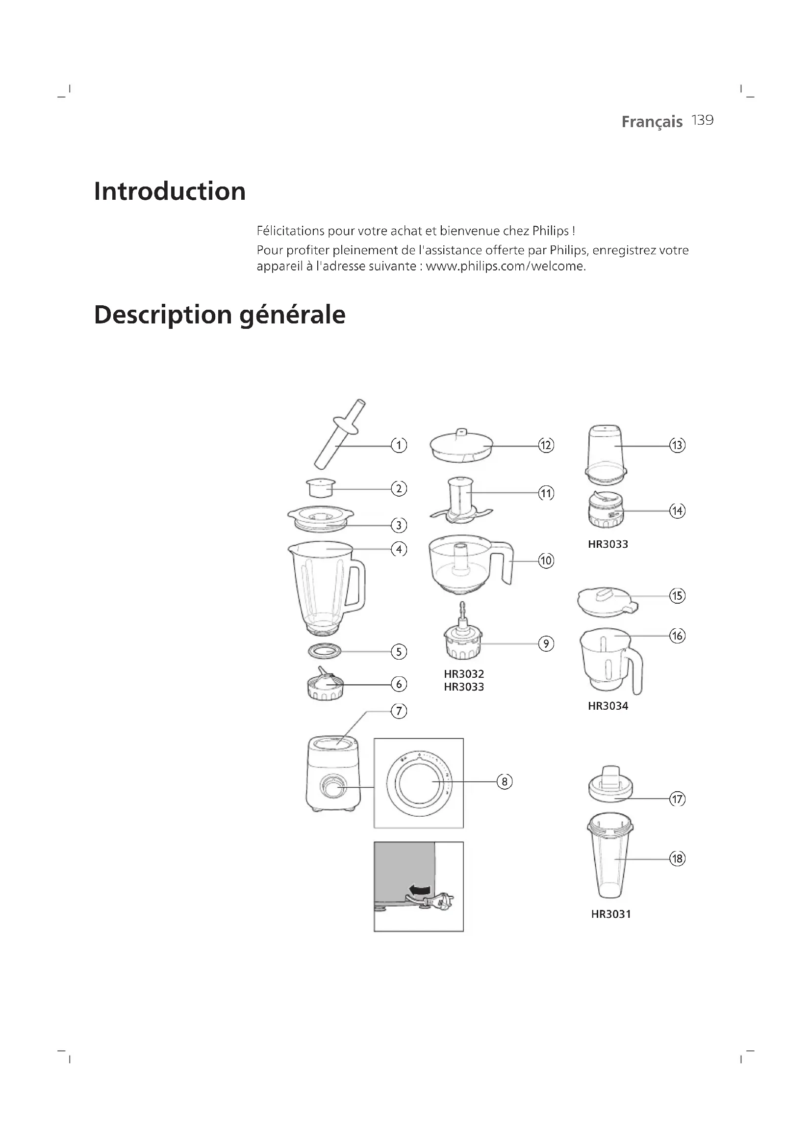 Français Français Introduction Félicitations pour votre achat et bienvenue chez Philips! Pour profiter pleinement de l'assistance offerte par Philips, enregistrez votre appareil à l'adresse suivante: www.philips.com/welcome. Description générale HR3034HR3031 HR3033HR3032 HR3033