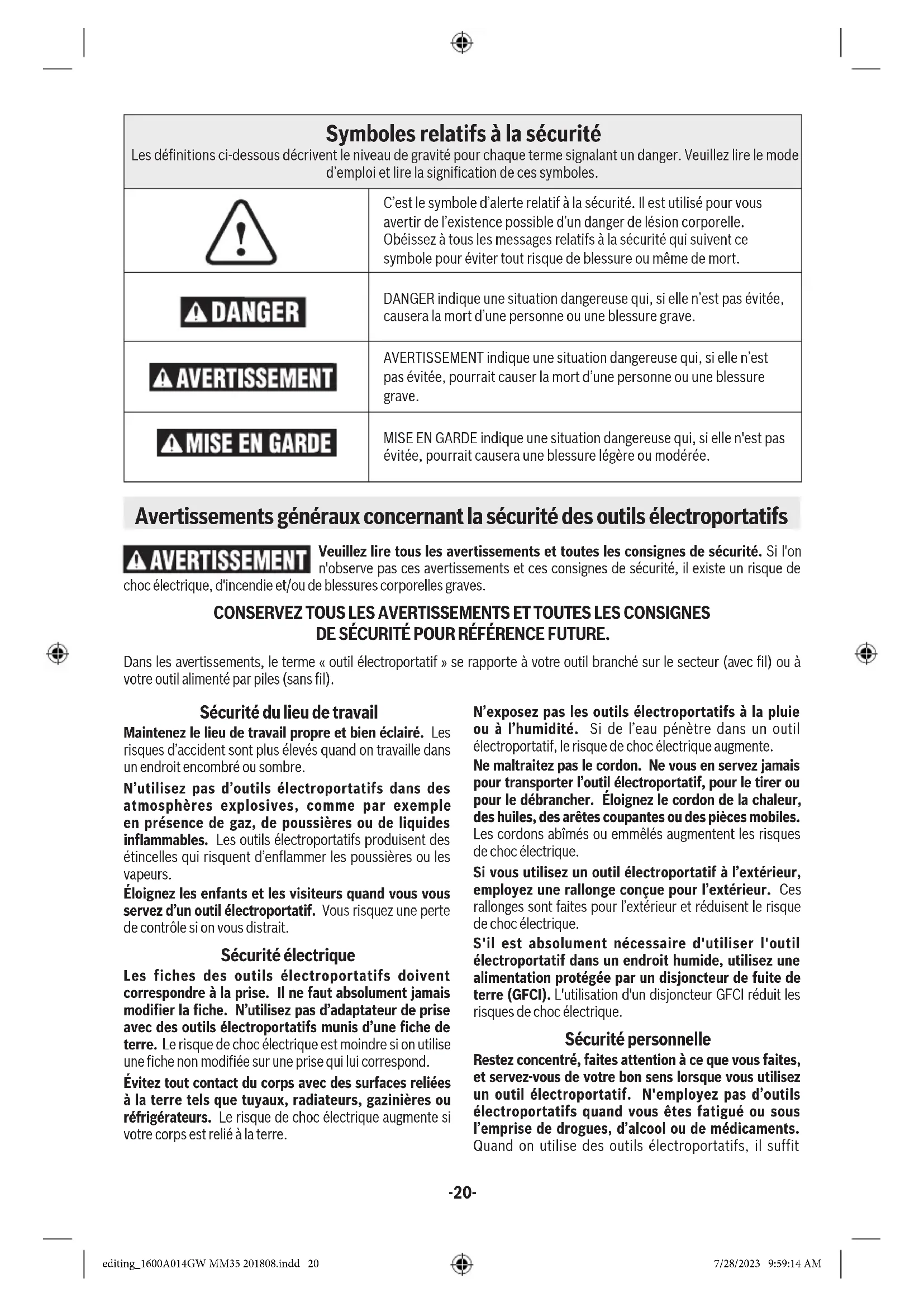 editing_1600A014GW MM35 201808.indd 19editing_1600A014GW MM35 201808.indd 19 7/28/2023 9:59:13 AM7/28/2023 9:59:13 AM-20- Veuillez lire tous les avertissements et toutes les consignes de sécurité. Si l'on n'observe pas ces avertissements et ces consignes de sécurité, il existe un risque de choc électrique, d'incendie et/ou de blessures corporelles graves. CONSERVEZ TOUS LES AVERTISSEMENTS ET TOUTES LES CONSIGNES DE SÉCURITÉ POUR RÉFÉRENCE FUTURE. Dans les avertissements, le terme « outil électroportatif » se rapporte à votre outil branché sur le secteur (avec fil) ou à votre outil alimenté par piles (sans fil). Avertissements généraux concernant la sécurité des outils électroportatifs Sécurité du lieu de travail Maintenez le lieu de travail propre et bien éclairé. Les risques d’accident sont plus élevés quand on travaille dans un endroit encombré ou sombre. N’utilisez pas d’outils électroportatifs dans des atmosphères explosives, comme par exemple en présence de gaz, de poussières ou de liquides inflammables. Les outils électroportatifs produisent des étincelles qui risquent d’enflammer les poussières ou les vapeurs. Éloignez les enfants et les visiteurs quand vous vous servez d’un outil électroportatif. Vous risquez une perte de contrôle si on vous distrait. Sécurité électrique Les fiches des outils électroportatifs doivent correspondre à la prise. Il ne faut absolument jamais modifier la fiche. N’utilisez pas d’adaptateur de prise avec des outils électroportatifs munis d’une fiche de terre. Le risque de choc électrique est moindre si on utilise une fiche non modifiée sur une prise qui lui correspond. Évitez tout contact du corps avec des surfaces reliées à la terre tels que tuyaux, radiateurs, gazinières ou réfrigérateurs. Le risque de choc électrique augmente si votre corps est relié à la terre. N’exposez pas les outils électroportatifs à la pluie ou à l’humidité. Si de l’eau pénètre dans un outil électroportatif, le risque de choc électrique augmente. Ne maltraitez pas le cordon. Ne vous en servez jamais pour transporter l’outil électroportatif, pour le tirer ou pour le débrancher. Éloignez le cordon de la chaleur, des huiles, des arêtes coupantes ou des pièces mobiles. Les cordons abîmés ou emmêlés augmentent les risques de choc électrique. Si vous utilisez un outil électroportatif à l’extérieur, employez une rallonge conçue pour l’extérieur. Ces rallonges sont faites pour l’extérieur et réduisent le risque de choc électrique. S'il est absolument nécessaire d'utiliser l'outil électroportatif dans un endroit humide, utilisez une alimentation protégée par un disjoncteur de fuite de terre (GFCI). L'utilisation d'un disjoncteur GFCI réduit les risques de choc électrique. Sécurité personnelle Restez concentré, faites attention à ce que vous faites, et servez-vous de votre bon sens lorsque vous utilisez un outil électroportatif. N'employez pas d’outils électroportatifs quand vous êtes fatigué ou sous l’emprise de drogues, d’alcool ou de médicaments. Quand on utilise des outils électroportatifs, il suffit Symboles relatifs à la sécurité Les définitions ci-dessous décrivent le niveau de gravité pour chaque terme signalant un danger. Veuillez lire le mode d’emploi et lire la signification de ces symboles. C’est le symbole d’alerte relatif à la sécurité. Il est utilisé pour vous avertir de l’existence possible d’un danger de lésion corporelle. Obéissez à tous les messages relatifs à la sécurité qui suivent ce symbole pour éviter tout risque de blessure ou même de mort. DANGER indique une situation dangereuse qui, si elle n’est pas évitée, causera la mort d’une personne ou une blessure grave. AVERTISSEMENT indique une situation dangereuse qui, si elle n’est pas évitée, pourrait causer la mort d’une personne ou une blessure grave. MISE EN GARDE indique une situation dangereuse qui, si elle n'est pas évitée, pourrait causera une blessure légère ou modérée. editing_1600A014GW MM35 201808.indd 20editing_1600A014GW MM35 201808.indd 20 7/28/2023 9:59:14 AM7/28/2023 9:59:14 AM-21- Consignes de sécurité pour les outils oscillants Tenez seulement l’outil électroportatif par ses surfaces de préhension isolées lorsque vous effectuez une opération lors de laquelle l’accessoire de coupe peut entrer en contact avec des câbles cachés ou son propre cordon d’alimentation. L’entrée en contact d’un accessoire de coupe avec un fil sous tension pourrait rendre conductrices des parties en métal exposées de l’outil électroportatif et causer un choc électrique à l’opérateur. Utilisez des brides ou d’autres moyens pratiques de brider ou de supporter la pièce sur une plate-forme stable. Tenir la pièce à la main ou contre le corps est instable et risque de résulter en une perte de contrôle. Ne percez, fixez et ne rentrez pas dans des murs existants ou autres endroits aveugles pouvant abriter des fils électriques. Si cette situation est inévitable, débranchez tous les fusibles ou les disjoncteurs alimentant ce site. Utilisez un détecteur de métaux afin d’établir s’il y a des tuyaux d’eau ou à gaz dissimulés dans l’aire de travail ou appelez la compagnie de service public locale pour assistance avant de commencer l’opération. Le fait de frapper une conduite de gaz ou de couper dans celle-ci provoquera une explosion. L’eau pénétrant dans un appareil électrique peut entraîner une électrocution. d’un moment d’inattention pour causer des blessures corporelles graves. Utilisez des équipements de sécurité personnelle. Portez toujours une protection oculaire. Le port d'équipements de sécurité tels que des masques antipoussières, des chaussures de sécurité antidérapantes, des casques de chantier et des protecteurs d'oreilles dans des conditions appropriées réduira le risque de 