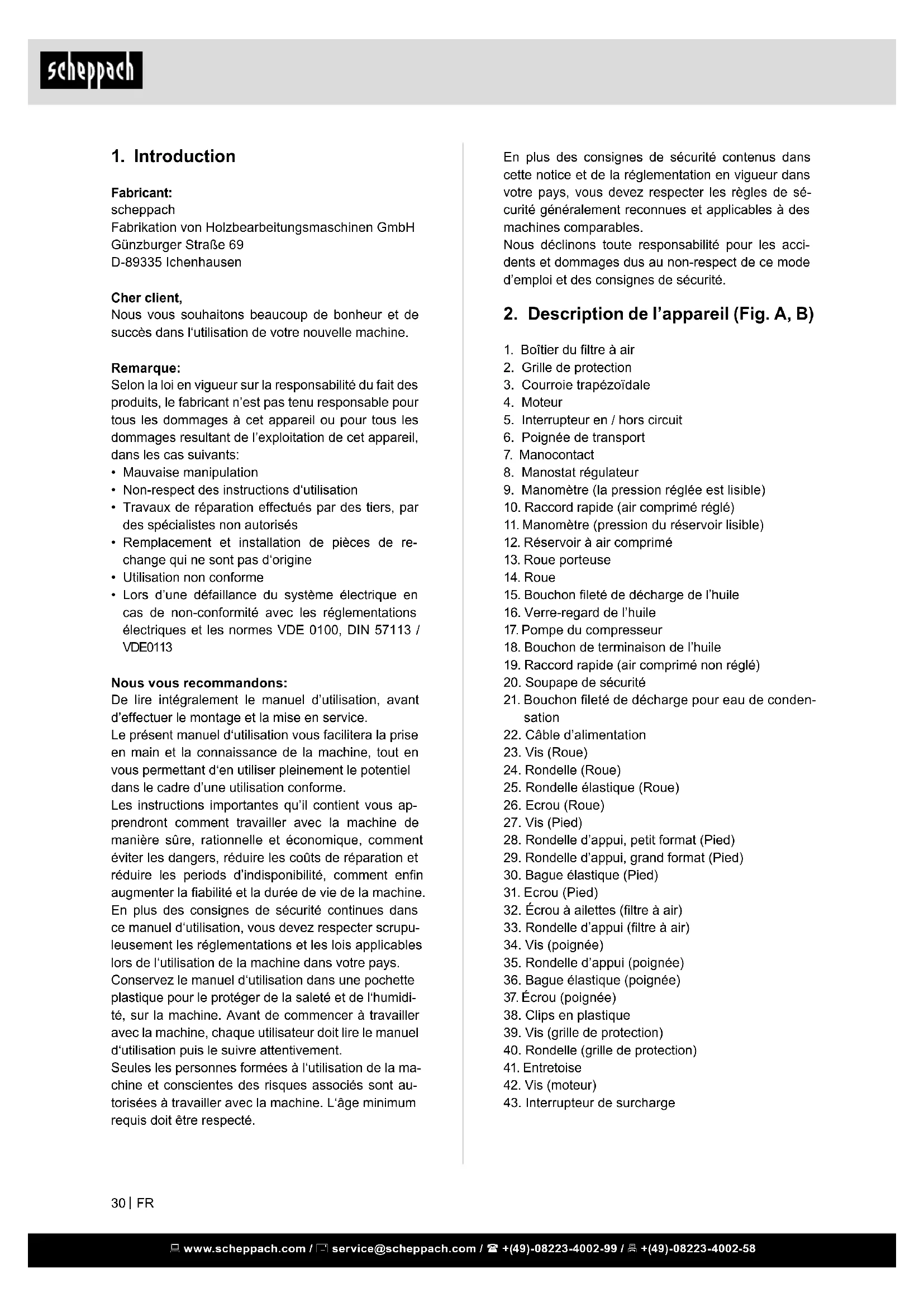 - Données gurant sur la plaque signalétique du mo- teur Informations service après-vente Il faut tenir compte du fait que pour ce produit les pièces suivantes sont soumises à une usure liée à l‘utilisation ou à une usure naturelle ou que les pièces suivantes sont nécessaires en tant que consom- mables. Pièces d‘usure*: Filtres à air, courroies, cylindres, pis- tons, segments, Clips en plastique *Pas obligatoirement compris dans la livraison ! www.scheppach.com / service@scheppach.com / +(49)-08223-4002-99 / +(49)-08223-4002-58