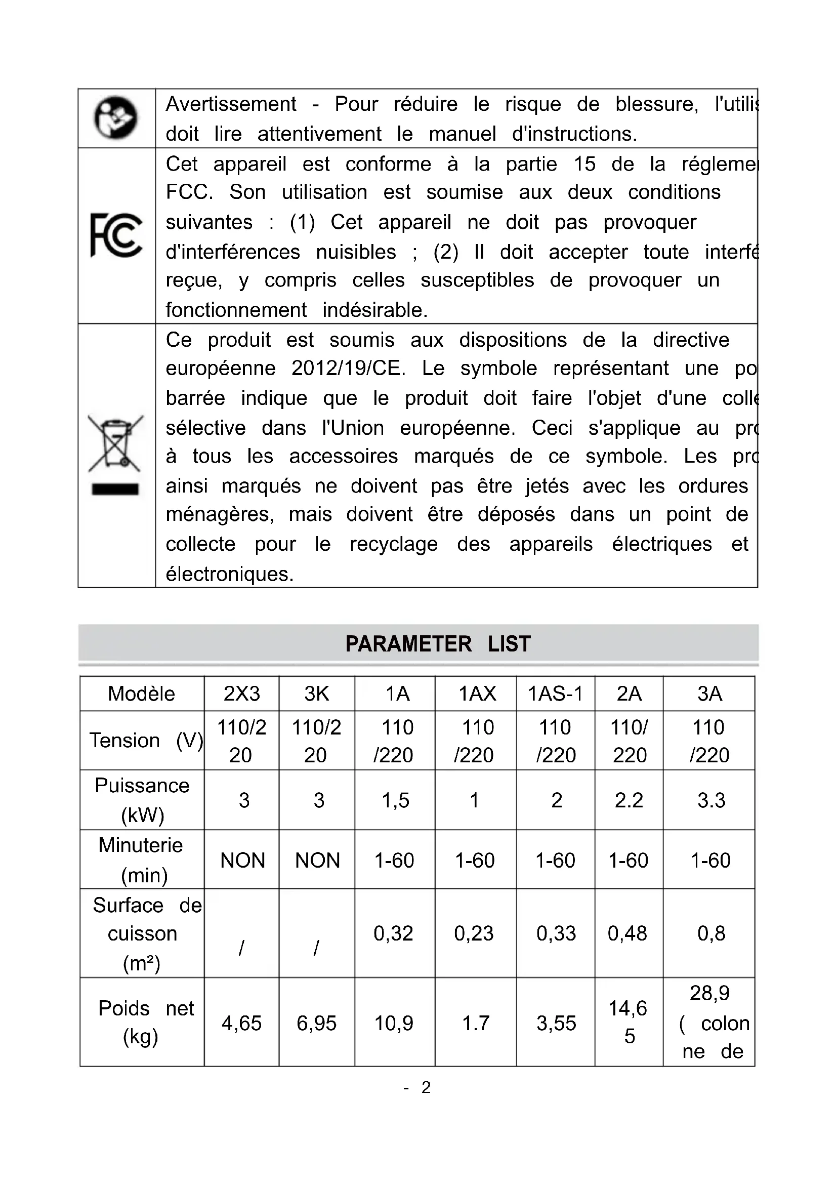 MODÈLE : 2X3, 3K, 1A, 1AX, 1AS-1, 2A, 3A We continue to be committed to provide you tools with competitive price. "Save Half", "Half Price" or any other similar expressions used by us only represents an estimate of savings you might benefit from buying certain tools with us compared to the major top brands and does not necessarily mean to cover all categories of tools offered by us. You are kindly reminded to verify carefully when you are placing an order with us if you are actually saving half in comparison with the top major brands.- 1 - MODÈLE : 2X3, 3K, 1A, 1AX, 1AS-1, 2A, 3A Have product questions? Need technical support? Please feel free to contact us: Technical Support and E-Warranty Certificate www.vevor.com/support NEED HELP? CONTACT US! This is the original instruction, please read all manual instructions carefully before operating. VEVOR reserves a clear interpretation of our user manual. The appearance of the product shall be subject to the product you received. Please forgive us that we won't inform you again if there are any technology or software updates on our product. Infrared Paint Lamp- 2 - Avertissement - Pour réduire le risque de blessure, l'utilisateur doit lire attentivement le manuel d'instructions. Cet appareil est conforme à la partie 15 de la réglementation FCC. Son utilisation est soumise aux deux conditions suivantes : (1) Cet appareil ne doit pas provoquer d'interférences nuisibles ; (2) Il doit accepter toute interférence reçue, y compris celles susceptibles de provoquer un fonctionnement indésirable. Ce produit est soumis aux dispositions de la directive européenne 2012/19/CE. Le symbole représentant une poubelle barrée indique que le produit doit faire l'objet d'une collecte sélective dans l'Union européenne. Ceci s'applique au produit et à tous les accessoires marqués de ce symbole. Les produits ainsi marqués ne doivent pas être jetés avec les ordures ménagères, mais doivent être déposés dans un point de collecte pour le recyclage des appareils électriques et électroniques. PARAMETER LIST Modèle 2X3