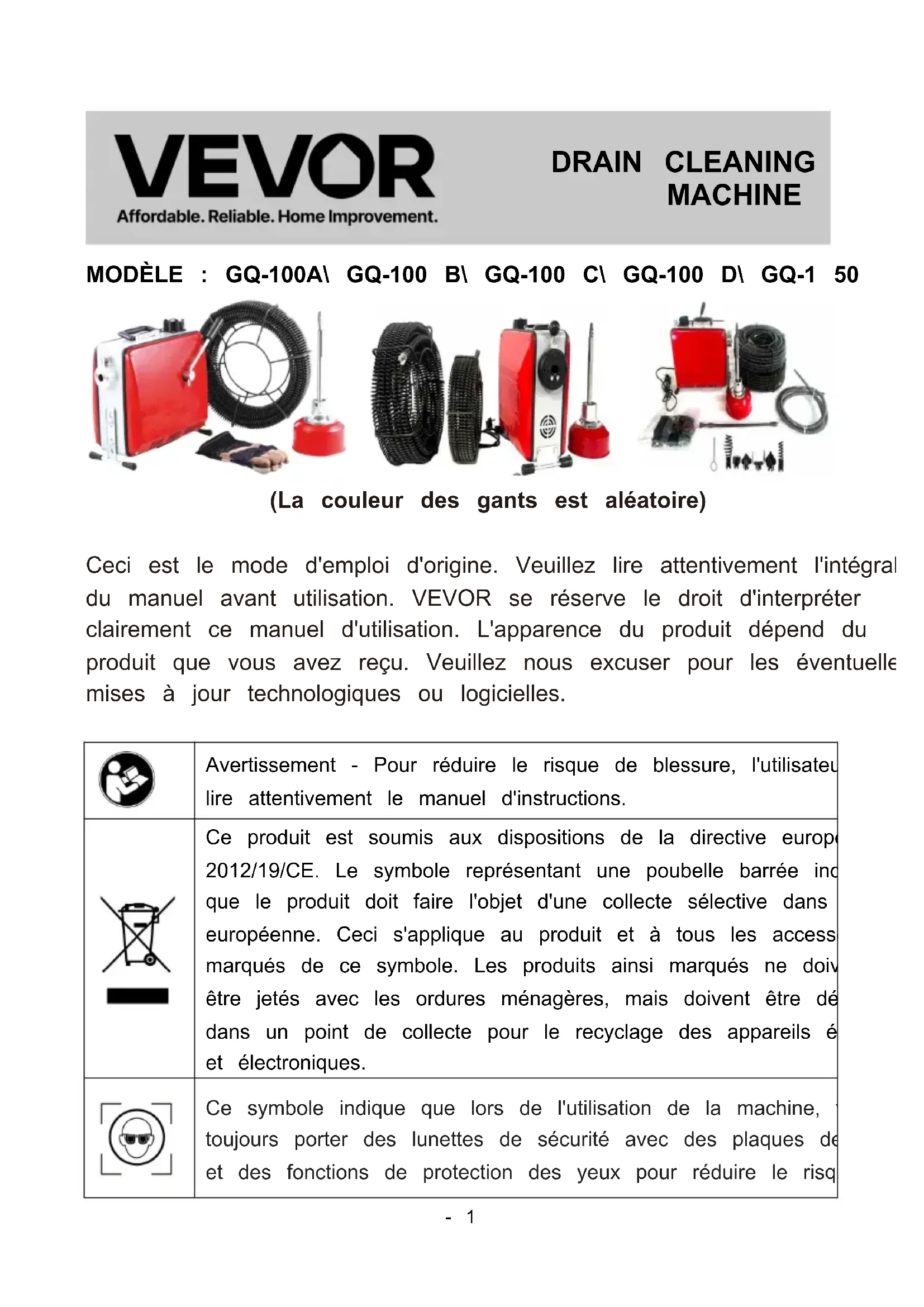 GQ-100 B GQ-100 C GQ-100 D GQ-150- 1 - MODÈLE : GQ-100A\ GQ-100 B\ GQ-100 C\ GQ-100 D\ GQ-1 50 (La couleur des gants est aléatoire) Ceci est le mode d'emploi d'origine. Veuillez lire attentivement l'intégralité du manuel avant utilisation. VEVOR se réserve le droit d'interpréter clairement ce manuel d'utilisation. L'apparence du produit dépend du produit que vous avez reçu. Veuillez nous excuser pour les éventuelles mises à jour technologiques ou logicielles. Avertissement - Pour réduire le risque de blessure, l'utilisateur doit lire attentivement le manuel d'instructions. Ce produit est soumis aux dispositions de la directive européenne 2012/19/CE. Le symbole représentant une poubelle barrée indique que le produit doit faire l'objet d'une collecte sélective dans l'Union européenne. Ceci s'applique au produit et à tous les accessoires marqués de ce symbole. Les produits ainsi marqués ne doivent pas être jetés avec les ordures ménagères, mais doivent être déposés dans un point de collecte pour le recyclage des appareils électriques et électroniques. Ce symbole indique que lors de l'utilisation de la machine, veuillez toujours porter des lunettes de sécurité avec des plaques de protection et des fonctions de protection des yeux pour réduire le risque de DRAIN CLEANING MACHINE- 2 - blessure aux yeux. Ce symbole indique le danger que les mains, les doigts ou d'autres parties du corps se coincent dans le câble de la machine de dragage. Le symbole indique le danger d'être impliqué dans la courroie et la poulie. Le symbole indique le danger d'un choc électrique. INSTRUCTIONS Consignes de sécurité Veuillez lire attentivement toutes les précautions et consignes de sécurité. Le non-respect de ces consignes peut entraîner un choc électrique, un incendie ou des blessures graves. Veuillez conserver ces précautions et consignes de sécurité. Précautions de sécurité sur le lieu de travail