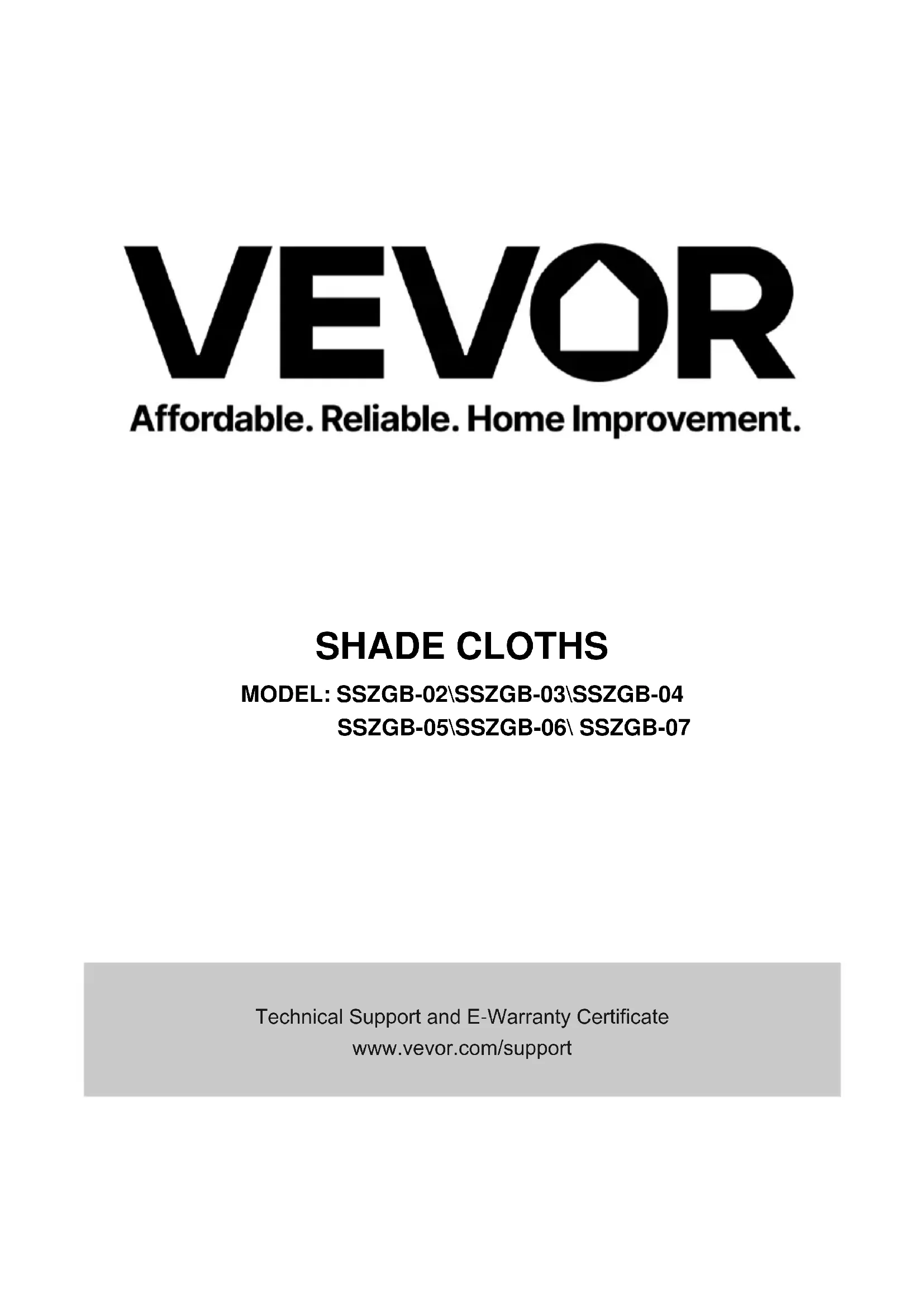 TOILESD'OMBRAGE Assistancetechniqueetcertificatdegarantie électroniquewww.vevor.com/support Machine Translated by GoogleSSZGB07 Ceciestlemoded'emploid'origine.Veuillezlireattentivement l'intégralitédumanuelavantutilisation.VEVORseréserveledroit d'interpréterclairementcemanueld'utilisation.L'apparencedu produitdépendduproduitquevousavezreçu.Veuilleznousexcuser pourleséventuellesmisesàjourtechnologiquesoulogicielles.