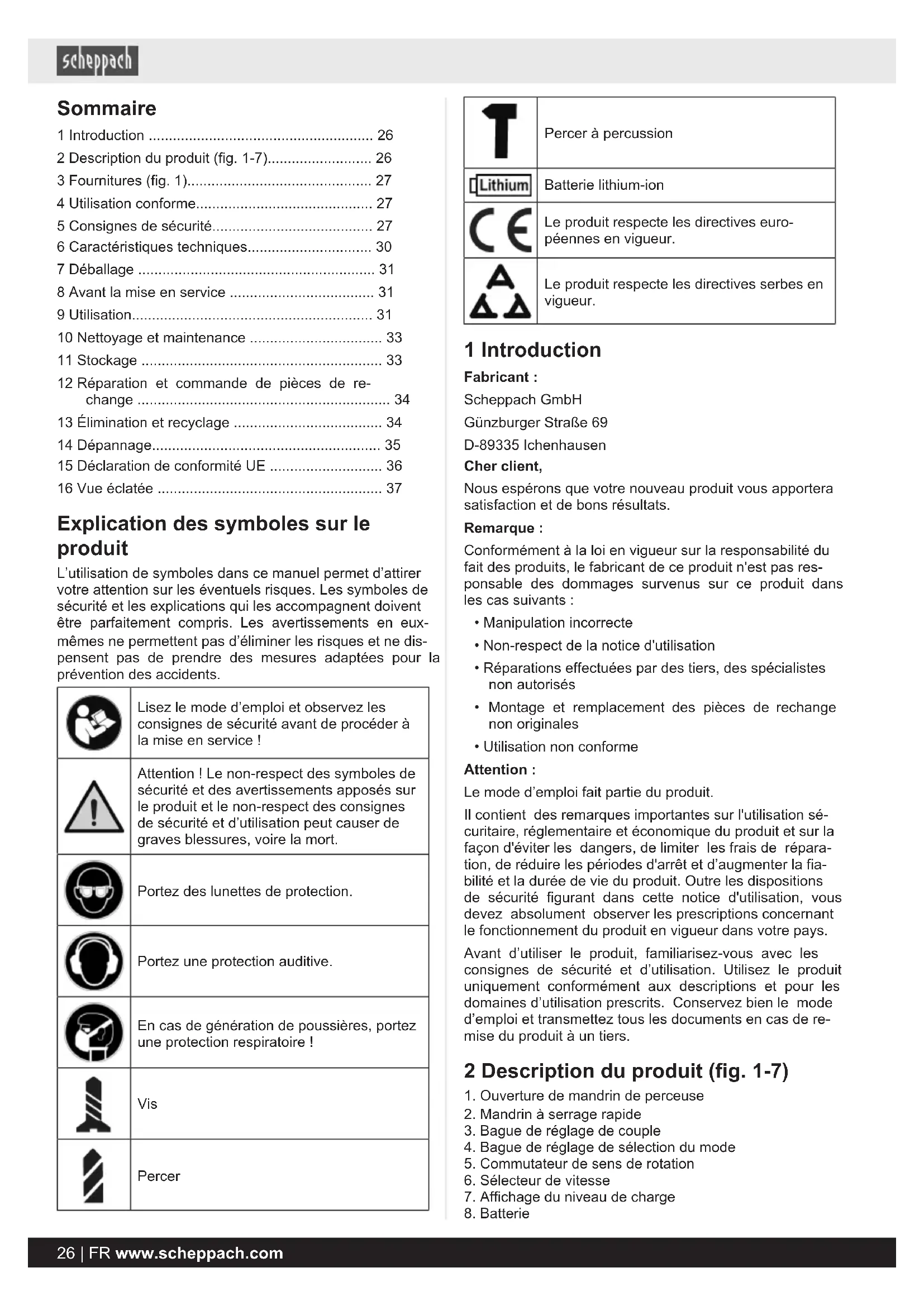 - 16 Vue éclatée Explication des symboles sur le produit L’utilisation de symboles dans ce manuel permet d’attirer votre attention sur les éventuels risques. Les symboles de sécurité et les explications qui les accompagnent doivent être parfaitement compris. Les avertissements en eux- mêmes ne permettent pas d’éliminer les risques et ne dis- pensent pas de prendre des mesures adaptées pour la prévention des accidents. Lisez le mode d’emploi et observez les consignes de sécurité avant de procéder à la mise en service! Attention! Le non-respect des symboles de sécurité et des avertissements apposés sur le produit et le non-respect des consignes de sécurité et d’utilisation peut causer de graves blessures, voire la mort. Portez des lunettes de protection. Portez une protection auditive. En cas de génération de poussières, portez une protection respiratoire! Vis Percer Percer à percussion Batterie lithium-ion Le produit respecte les directives euro- péennes en vigueur. Le produit respecte les directives serbes en vigueur. 1 Introduction Fabricant: Scheppach GmbH Günzburger Straße 69 D-89335 Ichenhausen Cher client, Nous espérons que votre nouveau produit vous apportera satisfaction et de bons résultats. Remarque: Conformément à la loi en vigueur sur la responsabilité du fait des produits, le fabricant de ce produit n'est pas res- ponsable des dommages survenus sur ce produit dans les cas suivants: p. 37