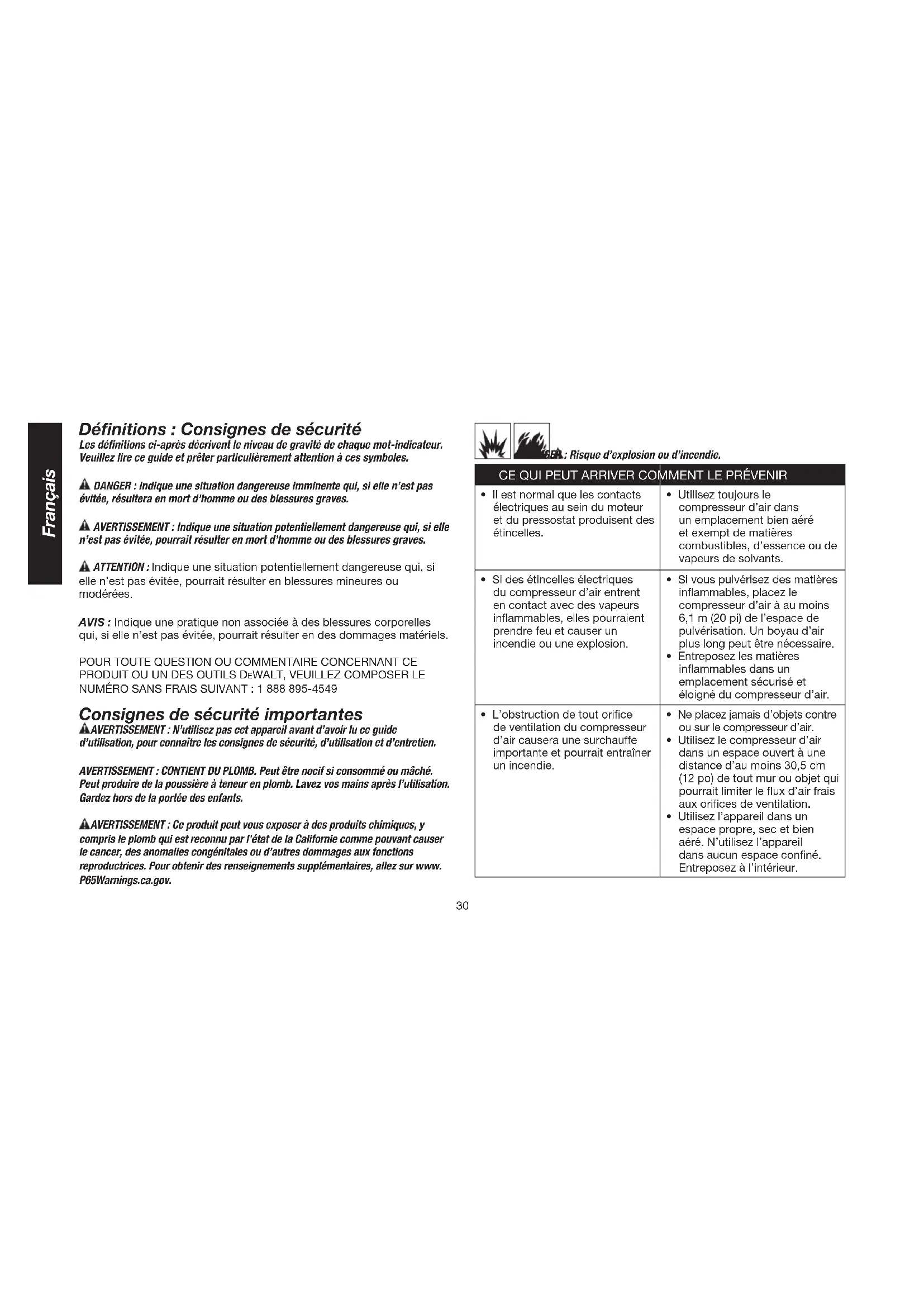 Air compressor too cold. Move air compressor to a warmer location.30 Français Définitions: Consignes de sécurité Les définitions ci-après décrivent le niveau de gravité de chaque mot-indicateur. Veuillez lire ce guide et prêter particulièrement attention à ces symboles.