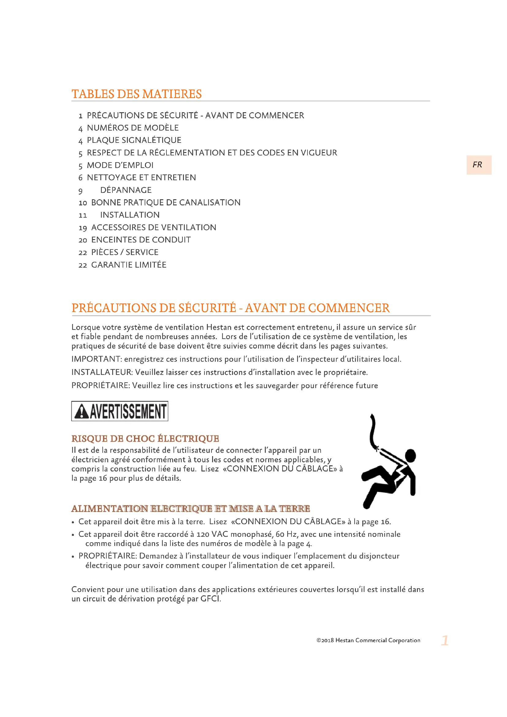 Lorsque votre système de ventilation Hestan est correctement entretenu, il assure un service sûr et fiable pendant de nombreuses années. Lors de l’utilisation de ce système de ventilation, les pratiques de sécurité de base doivent être suivies comme décrit dans les pages suivantes. IMPORTANT: enregistrez ces instructions pour l’utilisation de l’inspecteur d’utilitaires local. INSTALLATEUR: Veuillez laisser ces instructions d’installation avec le propriétaire. PROPRIÉTAIRE: Veuillez lire ces instructions et les sauvegarder pour référence future PRÉCAUTIONS DE SÉCURITÉ - AVANT DE COMMENCER