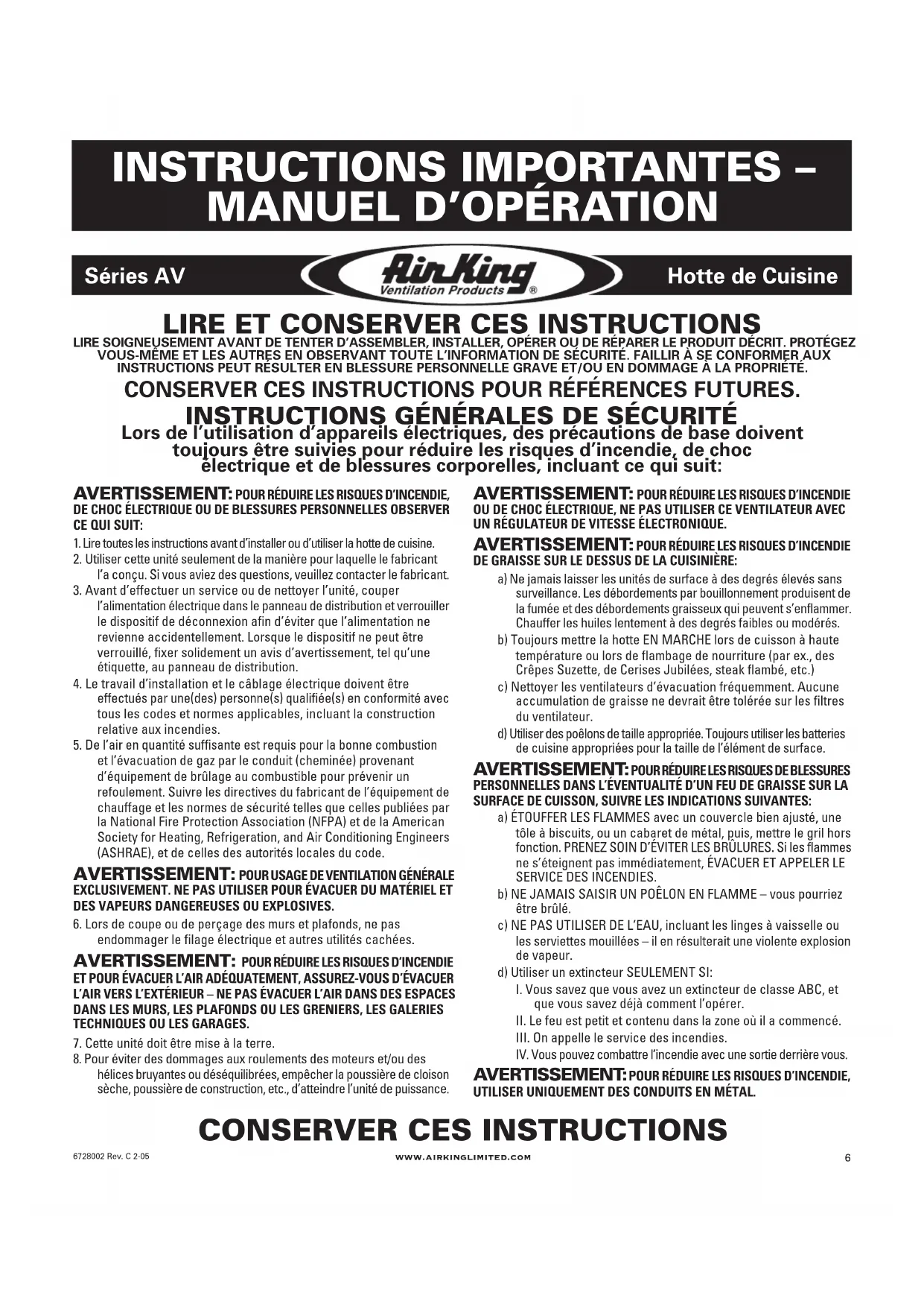 LIRE SOIGNEUSEMENT AVANT DE TENTER D’ASSEMBLER, INSTALLER, OPÉRER OU DE RÉPARER LE PRODUIT DÉCRIT. PROTÉGEZVOUS-MÊME ET LES AUTRES EN OBSERVANT TOUTE L’INFORMATION DE SÉCURITÉ. FAILLIR À SE CONFORMER AUXINSTRUCTIONS PEUT RÉSULTER EN BLESSURE PERSONNELLE GRAVE ET/OU EN DOMMAGE À LA PROPRIÉTÉ. CONSERVER CES INSTRUCTIONS POUR RÉFÉRENCES FUTURES. INSTRUCTIONS GÉNÉRALES DE SÉCURITÉ Lors de l’utilisation d’appareils électriques, des précautions de base doivent toujours être suivies pour réduire les risques d’incendie, de choc électrique et de blessures corporelles, incluant ce qui suit: Séries AV www.airkinglimited.com Hotte de Cuisine INSTRUCTIONS IMPORTANTES –