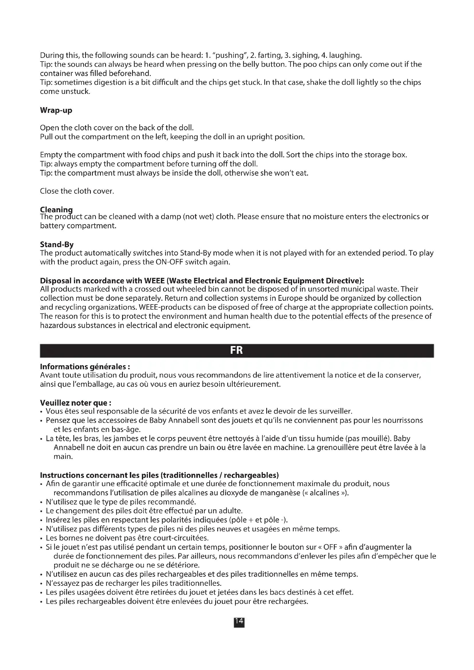 - La tête, les bras, les jambes et le corps peuvent être nettoyés à l’aide d’un tissu humide (pas mouillé). Baby Annabell ne doit en aucun cas prendre un bain ou être lavée en machine. La grenouillère peut être lavée à la main. Instructions concernant les piles (traditionnelles / rechargeables)