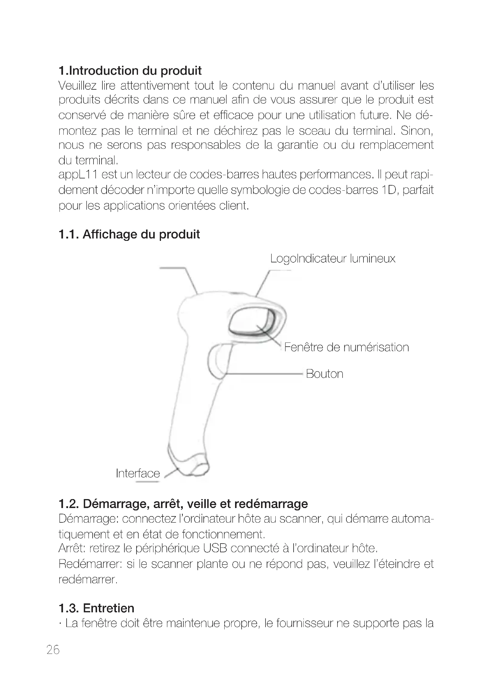 AEEREI-RAE 558 - Neste manual, o símbolo do caixote do lixo riscado com uma cruz indica que o produto está sujeito a uma diretiva europeia, a 2002/96 / CE, sobre produtos elétricos ou eletrónicos, as baterias e acumuladores e outros acessórios que devem necessariamente ser ob- jeto de recolha seletiva. No final da vida útil do aparelho, faça uso dos recipientes de reciclagem. Este gesto ajudará a reduzir os riscos para a saúde e preservar o meio ambiente. As câmaras municipais e os distribuidores fornecer-he-ão os detalhes essenciais sobre reciclagem do seu aparelho antigo. Se este apa- relho tiver uma bateria interna, ela deve ser removida e depositada separa- damente para a sua reciclagem correta.26 1.Introduction du produit Veuillez lire attentivement tout le contenu du manuel avant d’utiliser les produits décrits dans ce manuel afin de vous assurer que le produit est conservé de manière sûre et efficace pour une utilisation future. Ne dé- montez pas le terminal et ne déchirez pas le sceau du terminal. Sinon, nous ne serons pas responsables de la garantie ou du remplacement du terminal. appL11 est un lecteur de codes-barres hautes performances. Il peut rapi- dement décoder n’importe quelle symbologie de codes-barres 1D, parfait pour les applications orientées client. 1.1. Affichage du produit 1.2. Démarrage, arrêt, veille et redémarrage Démarrage: connectez l’ordinateur hôte au scanner, qui démarre automa- tiquement et en état de fonctionnement. Arrêt: retirez le périphérique USB connecté à l’ordinateur hôte. Redémarrer: si le scanner plante ou ne répond pas, veuillez l’éteindre et redémarrer. 1.3. Entretien
