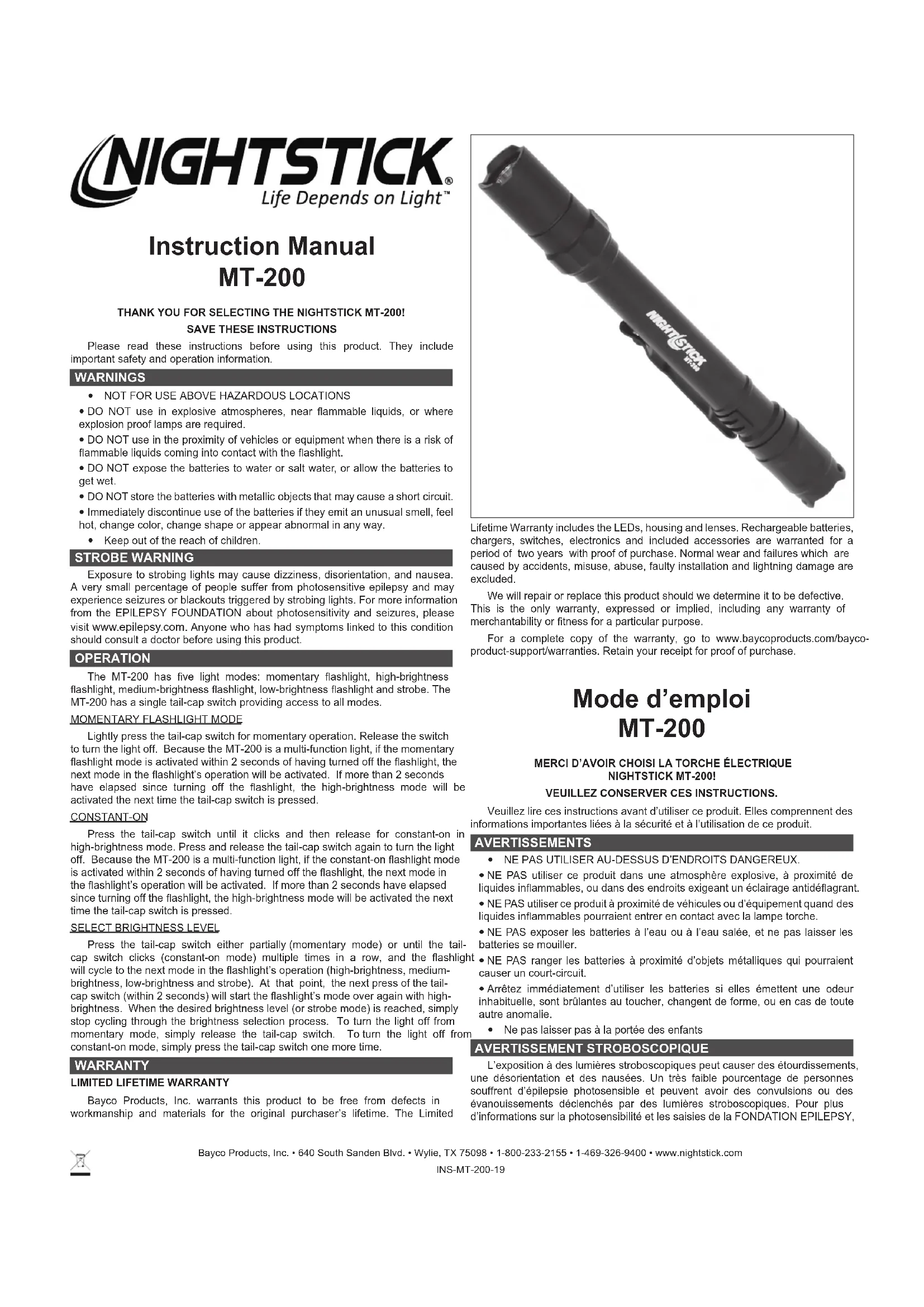 Bayco Products, Inc. warrants this product to be free from defects in workmanship and materials for the original purchaser’s lifetime. The Limited Lifetime Warranty includes the LEDs, housing and lenses. Rechargeable batteries, chargers, switches, electronics and included accessories are warranted for a period of two years with proof of purchase. Normal wear and failures which are caused by accidents, misuse, abuse, faulty installation and lightning damage are excluded. We will repair or replace this product should we determine it to be defective. This is the only warranty, expressed or implied, including any warranty of merchantability or tness for a particular purpose. For a complete copy of the warranty, go to www.baycoproducts.com/bayco- product-support/warranties. Retain your receipt for proof of purchase. Mode d’emploi MT-200 MERCI D’AVOIR CHOISI LA TORCHE ÉLECTRIQUE NIGHTSTICK MT-200! VEUILLEZ CONSERVER CES INSTRUCTIONS. Veuillez lire ces instructions avant d’utiliser ce produit. Elles comprennent des informations importantes liées à la sécurité et à l’utilisation de ce produit. AVERTISSEMENTS y NE PAS UTILISER AU-DESSUS D’ENDROITS DANGEREUX. y NE PAS utiliser ce produit dans une atmosphère explosive, à proximité de liquides inammables, ou dans des endroits exigeant un éclairage antidéagrant. y NE PAS utiliser ce produit à proximité de véhicules ou d’équipement quand des liquides inammables pourraient entrer en contact avec la lampe torche. y NE PAS exposer les batteries à l’eau ou à l’eau salée, et ne pas laisser les batteries se mouiller. y NE PAS ranger les batteries à proximité d’objets métalliques qui pourraient causer un court-circuit. y Arrêtez immédiatement d’utiliser les batteries si elles émettent une odeur inhabituelle, sont brûlantes au toucher, changent de forme, ou en cas de toute autre anomalie. y Ne pas laisser pas à la portée des enfants AVERTISSEMENT STROBOSCOPIQUE L’exposition à des lumières stroboscopiques peut causer des étourdissements, une désorientation et des nausées. Un très faible pourcentage de personnes souffrent d’épilepsie photosensible et peuvent avoir des convulsions ou des évanouissements déclenchés par des lumières stroboscopiques. Pour plus d’informations sur la photosensibilité et les saisies de la FONDATION EPILEPSY,Bayco Products, Inc. • 640 South Sanden Blvd. • Wylie, TX 75098 • 1-800-233-2155 • 1-469-326-9400 • www.nightstick.com INS-MT-200-19 y NO guarde las baterías con objetos de metal que pudieran causar un corto circuito. y Descontinúe inmediatamente el uso de las baterías si estas emiten un olor inusual, se sienten calientes, cambian de color, cambian de forma o parecen anormal de cualquier manera. y Mantener fuera del alcance de los niños.
