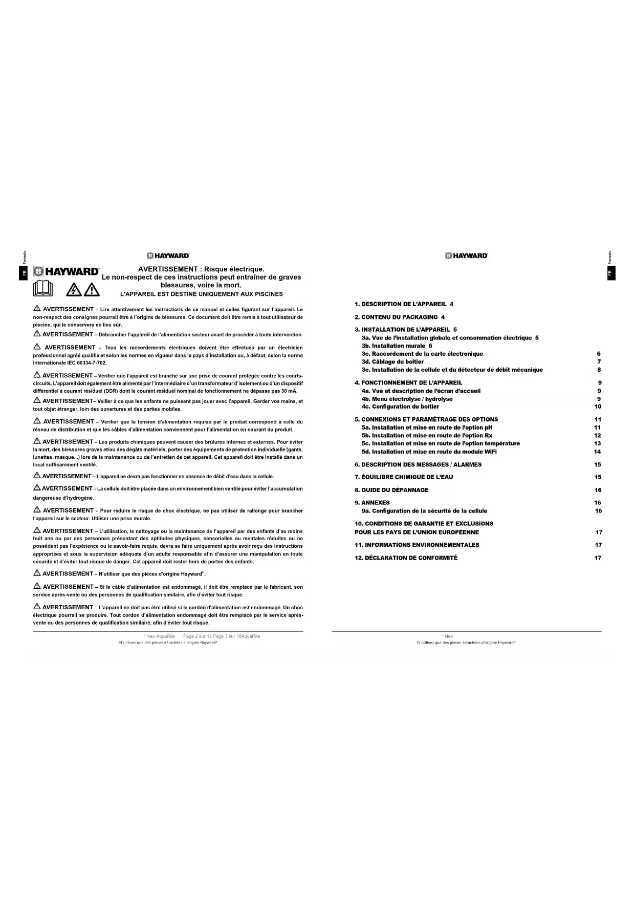 Neo Absence d’afchage Vérier le câble de connexion entre l’afcheur et le boîtier de contrôle. Vérier si le fusible 4 A n’est pas défaillant (situé à l’intérieur du boîtier de contrôle). Vérier l’alimentation électrique : 220-230 V 50/60 Hz. Si le problème persiste, contacter votre installateur/ piscinier. Excès de chlore Vérier et/ou ajuster le réglage de production de chlore. Si votre système comporte un système de contrôle automatique redox, vérier le réglage redox. Vérier la sonde redox et effectuer l’étalonnage si nécessaire. L’électrolyse n’atteint pas la production désirée Vérier la concentration de sel dans l’eau (en fonction du modèle). Vérier l’état de la cellule (celle-ci peut être entartrée ou sale). Nettoyer la cellule suivant les instructions. Vérier et nettoyer si besoin le détecteur de débit. Vérier que la cellule n’est pas usée (contacter votre installateur/piscinier). Cellule entartrée en moins de 1 mois Eau très dure avec un pH et une alcalinité totale élevés (équilibrer et ajuster le pH et l’alcalinité totale de l’eau). Vérier que le système change automatiquement de polarité (voir afcheur). Impossibilité d’atteindre un niveau de chlore libre de 1 ppm Augmenter la durée de ltration. Augmenter le niveau de production de chlore de l’électrolyse. Vérier la concentration de sel dans l’eau (cf. tableau équilibre chimique de l’eau). Vérier le niveau d’acide isocyanurique de la piscine (cf. tableau équilibre chimique de l’eau). Vérier que les agents réactifs de votre kit de test ne sont pas périmés. Ajuster la production de chlore en fonction de la température et du nombre d’utilisateurs de la piscine. Ajuster le pH pour qu’il soit toujours en dessous de 7,8. Flocons blancs dans la piscine Cela se produit lorsque l’eau est déséquilibrée et très dure. Équilibrer l’eau, vérier la cellule et la nettoyer si nécessaire. Changement de la pile Dévisser le couvercle avec l’aide des 4 vis et localiser l’emplacement de la pile (voir ci contre). Changer la pile (type CR2032). Revisser le couvercle avec l’aide des 4 vis. Disposition sur les déchets d’équipements électriques et électroniques des professionnels. Conformément à la directive 2012/19/UE relative à la gestion des déchets d’équipements électriques et électroniques, ce boîtier doit être déposé dans un point de collecte sélective. ==> pour plus d’informations, contacter votre distributeur. La bonne gestion des équipements électriques et électroniques contribue à prévenir les dommages à l’environnement et à la santé humaine. Conformément au réglement (UE) 2023/1542 du Parlement Européen et du Conseil du 12 juillet 2023 relatifs aux piles et accumulateurs ainsi qu’au déchets de piles et d’accumulateurs et modiant la directive 2008/98/CE et le règlement (UE) 2019/2020 et abrogeant la directive 2006/66/CE, le symbole qui accompagne ce manuel informe de l’obligation de collecte sélective de la pile incorporée dans le boîtier. Lorsque la pile arrive en n de vie, elle doit être retirée et déposée dans un point de collecte sélective. À la page précédente est indiqué comment procéder pour remplacer la pile. Ce produit est conforme aux normes suivantes : - Directive Basse tension 2014/35/UE, IEC 60335-1:2020, EN IEC 60335-1:2023+A11:2023, EN 62233:2008 + IPX4. - Directive CEM 2014/30/UE, EN IEC55014-1:2021, EN IEC 55014-2:2021, EN IEC 61000-3-2:2019+A1:2021, EN 61000-3-3 : 2013+A1:2019+A2:2021+AC:2022-01. - RoHS 2011/65/UE - Amendement (UE) 2015/863, Règlement (UE) 2024/1781 - DEEE Conformément au règlement (UE) 2023/988 relatif à la sécurité générale des produits, Hayward