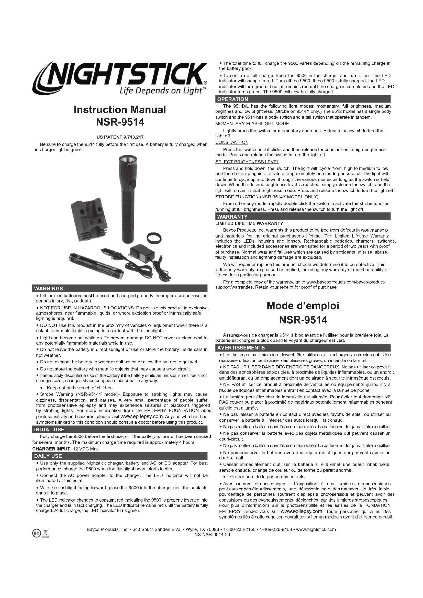 Bayco Products, Inc. warrants this product to be free from defects in workmanship and materials for the original purchaser’s lifetime. The Limited Lifetime Warranty includes the LEDs, housing and lenses. Rechargeable batteries, chargers, switches, electronics and included accessories are warranted for a period of two years with proof of purchase. Normal wear and failures which are caused by accidents, misuse, abuse, faulty installation and lightning damage are excluded. We will repair or replace this product should we determine it to be defective. This is the only warranty, expressed or implied, including any warranty of merchantability or tness for a particular purpose. For a complete copy of the warranty, go to www.baycoproducts.com/bayco-product- support/warranties. Retain your receipt for proof of purchase. Mode d’emploi NSR-9514 Assurez-vous de charger la 9514 à bloc avant de l’utiliser pour la première fois. La batterie est chargée à bloc quand le voyant du chargeur est vert. AVERTISSEMENTS y Les batteries au lithium-ion doivent être utilisées et rechargées correctement. Une mauvaise utilisation peut causer des blessures graves, un incendie ou la mort. y NE PAS UTILISER DANS DES ENDROITS DANGEREUX. Ne pas utiliser ce produit dans des atmosphères explosibles, à proximité de liquides inammables, ou un endroit antidéagrant ou un emplacement dont un éclairage à sécurité intrinsèque est requis. y NE PAS utiliser ce produit à proximité de véhicules ou équipements quand il y a risque de liquides inammables entrant en contact avec la lampe de poche. y La lumière peut être chaude lorsqu’elle est allumée. Pour éviter tout dommage NE PAS couvrir ou placer à proximité de matériaux potentiellement inammables pendant qu’elle est allumée. y Ne pas laisser la batterie en contact direct avec les rayons de soleil ou utiliser ou conserver la batterie à l’intérieur des autos lorsqu’il fait chaud. y Ne pas mettre la batterie dans l’eau ou l’eau salée. La batterie ne doit jamais être mouillée. y Ne pas conserver la batterie avec des objets métalliques qui peuvent causer un court-circuit. y Ne pas mettre la batterie dans l’eau ou l’eau salée. La batterie ne doit jamais être mouillée. y Ne pas conserver la batterie avec des objets métalliques qui peuvent causer un court-circuit. y Cesser immédiatement d’utiliser la batterie si elle émet une odeur inhabituelle, semble chaude, change de couleur ou de forme ou paraît anormal. y Garder hors de la portée des enfants. y Avertissement stroboscopique - L’exposition à des lumières stroboscopiques peut causer des étourdissements, une désorientation et des nausées. Un très faible pourcentage de personnes souffrent d’épilepsie photosensible et peuvent avoir des convulsions ou des évanouissements déclenchés par des lumières stroboscopiques. Pour plus d’informations sur la photosensibilité et les saisies de la FONDATION EPILEPSY, rendez-vous sur www.epilepsy.com. Toute personne qui a eu des symptômes liés à cette condition devrait consulter un médecin avant d’utiliser ce produit.Bayco Products, Inc. • 640 South Sanden Blvd. • Wylie, TX 75098 • 1-800-233-2155 • 1-469-326-9400 • www.nightstick.com INS-NSR-9514-23 y NO utilice este producto en las proximidades de vehículos o equipos cuando hay un riesgo de que líquidos inamables entren en contacto con la linterna. y La luz puede calentarse mientras que está encendida. Para evitar daños, NO cubra ni la coloque al lado de cualquier material potencialmente inamable mientras esté en uso. y No deje la batería en la luz solar directa ni use o guarde la batería en el interior de los vehículos cuando hace calor. y No exponga la batería al agua o al agua salada, ni permita que la batería se moje. y No guarde la batería con objetos metálicos que puedan causar un cortocircuito. y Suspenda inmediatamente el uso de la batería si ésta emite un olor raro, se siente caliente, cambia de color, cambia de forma o parece anormal de alguna manera. y Mantener fuera del alcance de los niños. y Advertencia de luz estroboscópica - La exposición a luces estroboscópicas puede causar mareos, desorientación y náuseas. Un porcentaje muy pequeño de personas sufre de epilepsia fotosensible y pueden experimentar convulsiones o desmayos provocados por luces estroboscópicas. Para obtener más información de la FUNDACIÓN EPILEPSY sobre fotosensibilidad y ataques, visite www.epilepsy.com. Cualquier persona que haya tenido síntomas relacionados con esta afección debe consultar a un médico antes de usar este producto.