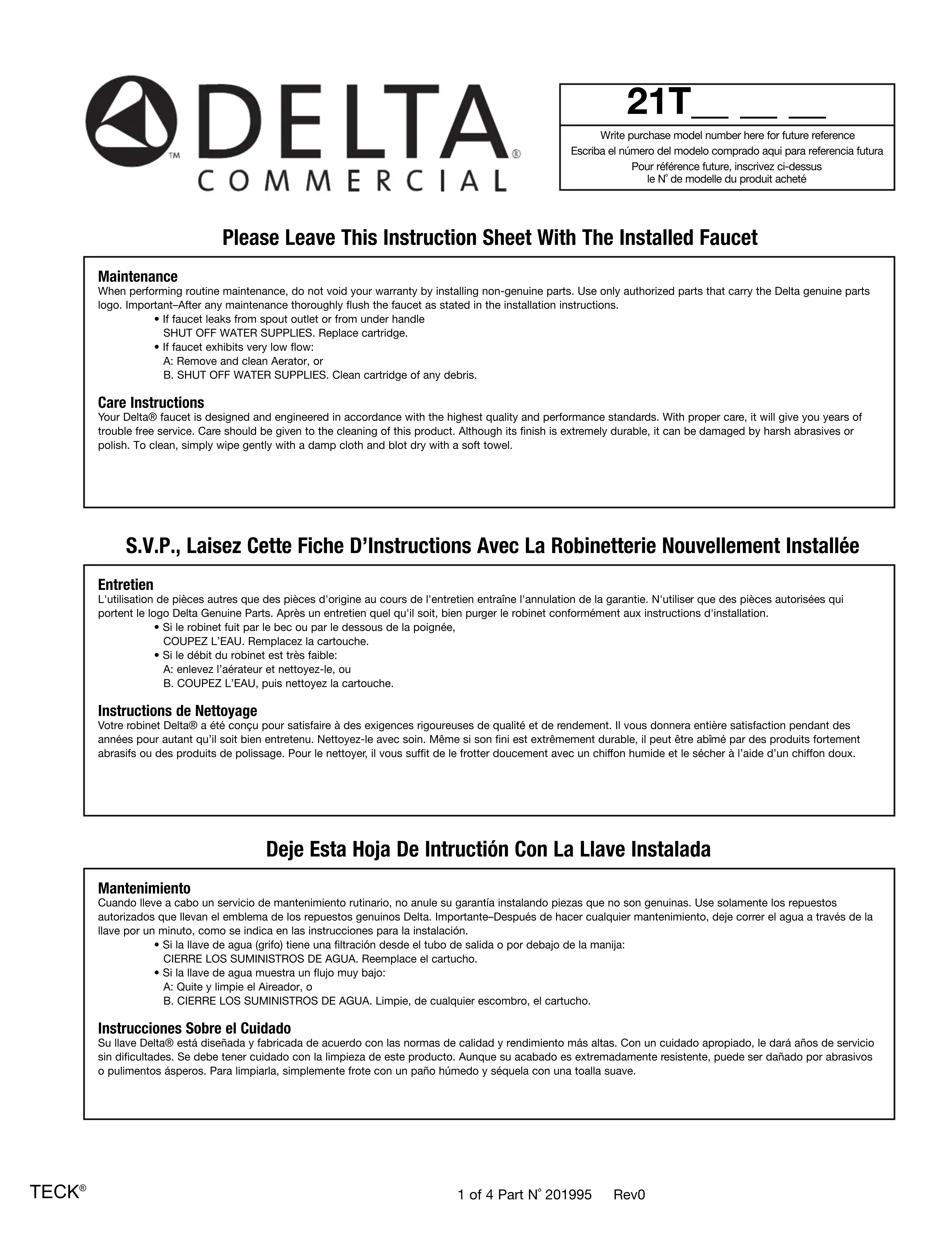 sont garanties contre tout défaut de matière, de finition et de main d’oeuvre pour une période de cinq (5) ans, sauf indication contraire stipulée dans le catalogue et la liste des prix. Cette garantie est offerte à l’acheteur original et entre en vigueur à compter de la date d’achat indiquée sur la preuve d’achat. Delta procédera, à son entière discrétion, à la réparation ou au remplacement, SANS FRAIS, durant la période de garantie, de toute pièce qui présente un défaut de matière ou de main d’oeuvre dans des conditions d’installation, d’usure, d’eau et de service normales. Si Delta Faucet détermine que la pièce retournée a été fabriquée par Delta Faucet et qu’en effet, cette pièce fait défaut, Delta Faucet respectera alors la garantie stipulée aux présentes. Les pièces de rechange peuvent être obtenues chez votre marchand local ou le distributeur inscrit dans votre annuaire téléphonique ou en retournant la pièce ainsi que la preuve d’achat à notre usine, FRAIS DE TRANSPORT PRÉPAYÉS, à l’adresse indiquée. CETTE GARANTIE EST LA SEULE GARANTIE EXPRESSE FAITE PAR DELTA. TOUTE RÉCLAMATION FAITE EN VERTU DE CETTE GARANTIE DOIT ÊTRE PRÉSENTÉE DURANT LA PÉRIODE DE CINQ ANS MENTIONNÉE CI-DESSUS. TOUTE GARANTIE IMPLICITE, Y COMPRIS LA GARANTIE IMPLICITE DE VALEUR COMMERCIALE RELATIVEMENT À L’APTITUDE À LA FONCTION, EST LIMITÉE EN TERMES DE DURÉE POUR LA DURÉE DE CETTE GARANTIE. LES FRAIS DE MAIN D’OEUVRE ET/OU DE DOMMAGES ENCOURUS DURANT L’INSTALLATION, LA RÉPARATION OU LE REMPLACEMENT AINSI QUE LES DOMMAGES-INTÉRÊTS ACCESSOIRES OU IMMATÉRIELS, SPÉCIAUX, INDIRECTS OU PUNITIFS S’Y RAPPORTANT SONT EXCLUS ET NE SERONT PAS PAYÉES PAR DELTA FAUCET. Certains états ne permettent pas la limitation de la durée de la garantie implicite, ou l’exclusion ou la limitation des dommages-intérêts accessoires ou immatériels, et par conséquent, les limitations ou les exclusions stipulées ci-dessus peuvent ne pas s’appliquer dans votre cas. Cette garantie vous accorde certains droits reconnus par la loi et vous avez peut-être aussi d’autres droits qui varient d’un état à l’autre. Cette garantie s’applique seulement aux produits commerciaux des sociétés Delta Faucet et Delta Faucet Canada et est nulle de plein droit pour tout dommage causé à ce robinet en raison d’usage excessif, d’abus, de négligence, d’accident, de mauvaise installation, tout usage en contravention des directives fournies par Delta Faucet ou tout usage de pièces de rechange autres que des pièces originales Delta. Garantía Limitada de las Llaves de Agua Comerciales Delta Todas las piezas de las llaves de agua (grifos) Delta