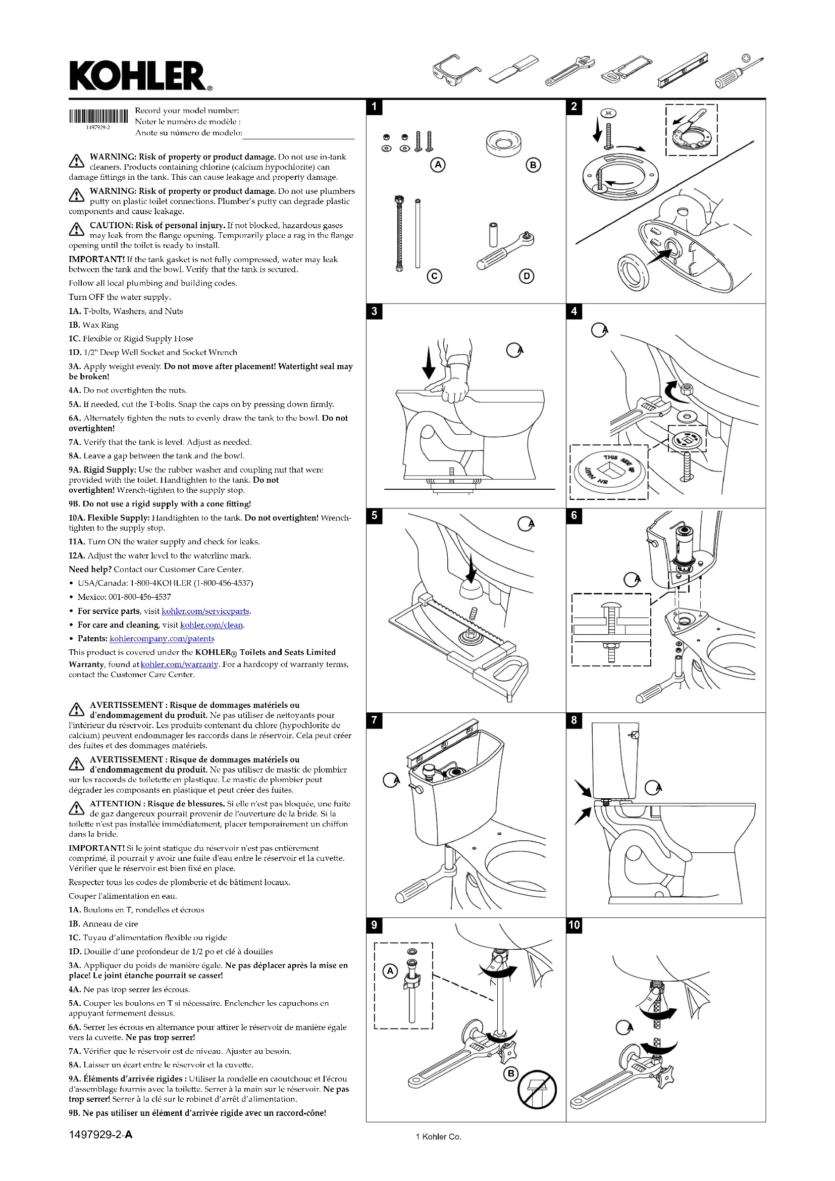 d'endommagement du produit. Ne pas utiliser de mastic de plombier sur les raccords de toiletee en plastique. Le mastic de plombier peut dégrader les composants en plastique et peut créer des fuites. ATTENTION : Risque de blessures. Si elle n'est pas bloquée, une fuite de gaz dangereux pourrait provenir de l'ouverture de la bride. Si la toilee n'est pas installée immédiatement, placer temporairement un chion dans la bride. IMPORTANT! Si le joint statique du réservoir n'est pas entièrement comprimé, il pourrait y avoir une fuite d'eau entre le réservoir et la cuvee. Vérier que le réservoir est bien xé en place. Respecter tous les codes de plomberie et de bâtiment locaux. Couper l'alimentation en eau. 1A. Boulons en T, rondelles et écrous 1B. Anneau de cire 1C. Tuyau d’alimentation exible ou rigide 1D. Douille d’une profondeur de 1/2 po et clé à douilles 3A. Appliquer du poids de manière égale. Ne pas déplacer après la mise en place! Le joint étanche pourrait se casser! 4A. Ne pas trop serrer les écrous. 5A. Couper les boulons en T si nécessaire. Enclencher les capuchons en appuyant fermement dessus. 6A. Serrer les écrous en alternance pour airer le réservoir de manière égale vers la cuvee. Ne pas trop serrer! 7A. Vérier que le réservoir est de niveau. Ajuster au besoin. 8A. Laisser un écart entre le réservoir et la cuvee. 9A. Éléments d’arrivée rigides : Utiliser la rondelle en caoutchouc et l’écrou d’assemblage fournis avec la toilee. Serrer à la main sur le réservoir. Ne pas trop serrer! Serrer à la clé sur le robinet d’arrêt d’alimentation. 9B. Ne pas utiliser un élément d’arrivée rigide avec un raccord-cône!