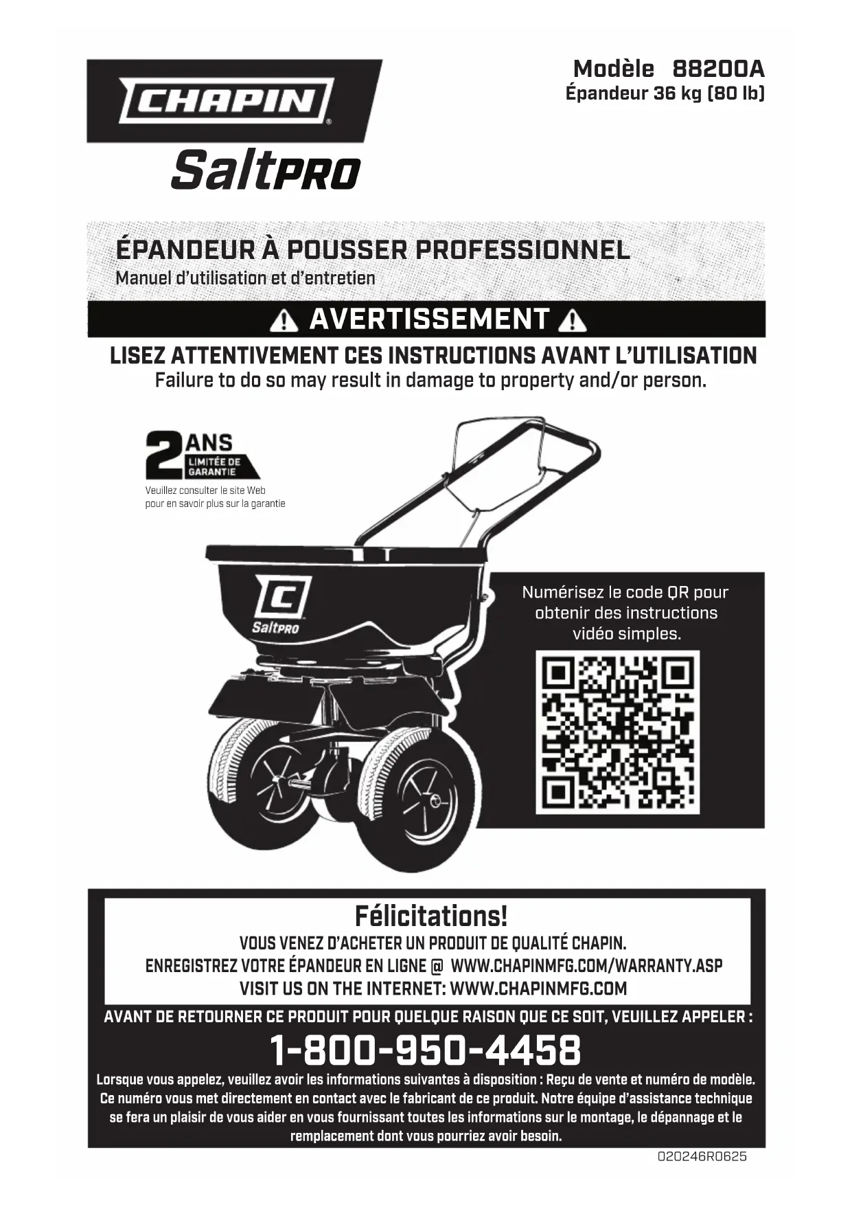 Manuel de l’ulisateur de l’épandeur Chapin - Français Pour plus d’informations sur l’étalonnage de votre épandeur Chapin : rendez-vous sur le site https://youtu.be/d-RPp8qrM1M Tableau de conversion d’application pour épandeur à pousser résidentiel et professionnel toute saiso SCOTTS 2 2.5 3 3.25 3.5 4 4.75 5 5.5 6 7 8 9 10 11 12 13 14 15 CHAPIN 9 10 11 11 12 13 14 14 15 16 17 19 20 22 23 25 26 28 30Congratulations! You have just purchased a quality Chapin product. Register Your Sprayer Online@ www.chapinmfg.com/warranty.aspDue to our ongoing product improvement process, product specifications may change without notice. Como resultado de nuestro continuo desarrollo de mejoras del producto, las especifcaciones de los mismos pueden cambiar sin previo aviso. En raison de notre programme d’amélioration des produits, leurs caractéristiques peuvent être modifiées sans préavis. P.O. Box 549 700 Ellicott St. Batavia, NY 14021-0549 U.S.A. 1-800-950-4458 www.chapinmfg.com © 2025 Chapin International, Inc.
