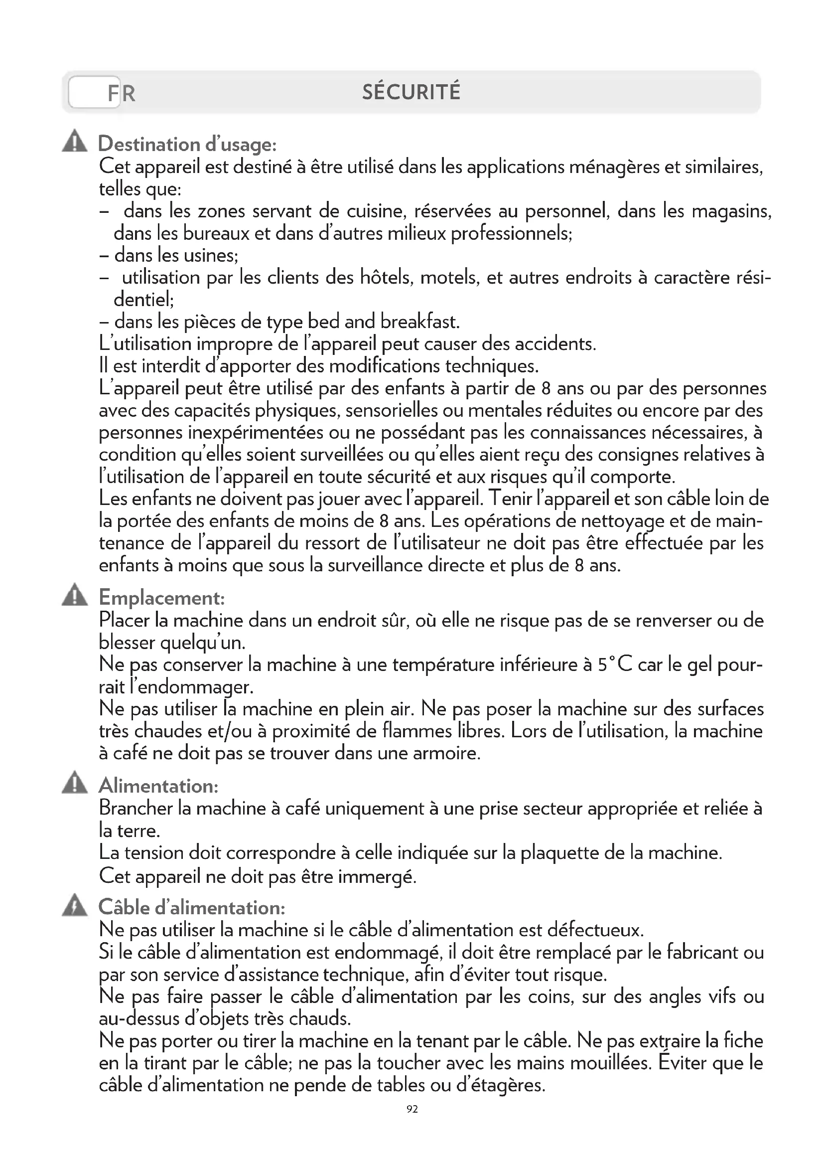 SÉCURITÉ Destination d’usage: Cet appareil est destiné à être utilisé dans les applications ménagères et similaires, telles que: – dans les zones servant de cuisine, réservées au personnel, dans les magasins, dans les bureaux et dans d’autres milieux professionnels; – dans les usines; – utilisation par les clients des hôtels, motels, et autres endroits à caractère rési- dentiel; – dans les pièces de type bed and breakfast. L’utilisation impropre de l’appareil peut causer des accidents. Il est interdit d’apporter des modifications techniques. L’appareil peut être utilisé par des enfants à partir de 8 ans ou par des personnes avec des capacités physiques, sensorielles ou mentales réduites ou encore par des personnes inexpérimentées ou ne possédant pas les connaissances nécessaires, à condition qu’elles soient surveillées ou qu’elles aient reçu des consignes relatives à l’utilisation de l’appareil en toute sécurité et aux risques qu’il comporte. Les enfants ne doivent pas jouer avec l’appareil. Tenir l’appareil et son câble loin de la portée des enfants de moins de 8 ans. Les opérations de nettoyage et de main- tenance de l’appareil du ressort de l’utilisateur ne doit pas être effectuée par les enfants à moins que sous la surveillance directe et plus de 8 ans. Emplacement: Placer la machine dans un endroit sûr, où elle ne risque pas de se renverser ou de blesser quelqu’un. Ne pas conserver la machine à une température inférieure à 5°C car le gel pour- rait l’endommager. Ne pas utiliser la machine en plein air. Ne pas poser la machine sur des surfaces très chaudes et/ou à proximité de flammes libres. Lors de l’utilisation, la machine à café ne doit pas se trouver dans une armoire. Alimentation: Brancher la machine à café uniquement à une prise secteur appropriée et reliée à la terre. La tension doit correspondre à celle indiquée sur la plaquette de la machine. Cet appareil ne doit pas être immergé. Câble d’alimentation: Ne pas utiliser la machine si le câble d’alimentation est défectueux. Si le câble d’alimentation est endommagé, il doit être remplacé par le fabricant ou par son service d’assistance technique, afin d’éviter tout risque. Ne pas faire passer le câble d’alimentation par les coins, sur des angles vifs ou au-dessus d’objets très chauds. Ne pas porter ou tirer la machine en la tenant par le câble. Ne pas extraire la fiche en la tirant par le câble; ne pas la toucher avec les mains mouillées. Éviter que le câble d’alimentation ne pende de tables ou d’étagères.FR