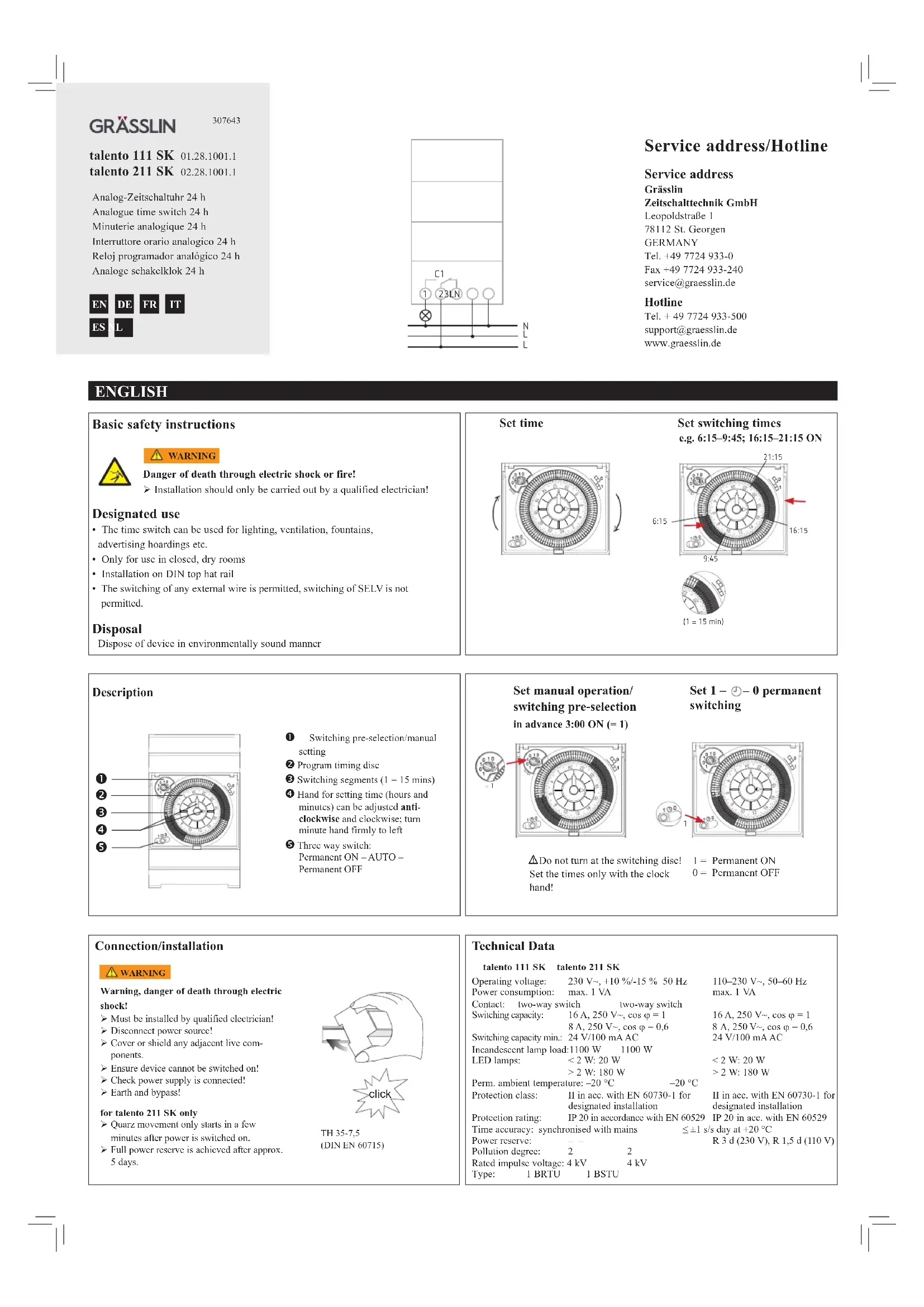 - Le raccordement de tout conducteur extérieur est autorisé, le raccordement de SELV n‘est pas accessible. Élimination Procéder à l´élimination de l´appareil selon les directives de protection de l´environnement.Danger de mort, risque d´électrocution et d´incendie! Le montage doit être effectué exclusivement par un électricien spécialisé!AVERTISSEMENT Description FRANÇAIS Raccordement/Montage Danger de mort, risque d´électrocution! Le montage doit être effectué exclusive- ment par un électricien spécialisé ! Couper la tension ! Recouvrir ou protéger les pièces sous tension à proximité. Protéger contre toute remise en marche ! Vérifier l´absence de tension ! Mettre à la terre et court-circuiter !uniquement pour talento 211 SK Le mécanisme à quartz ne démarre que quelques minutes après l´application de la tension. La pleine réserve de marche est atteinte à après env. 5 jours.AVERTISSEMENT talento 111 SK talento 211 SKTension de service : 230 V~, +10 %/-15 % 50 Hz 110–230 V~, 50–60 HzConsommation propre : max. 1 VA max. 1 VA Contact : inverseur inverseur Puissance de commutation : 16 A, 250 V~, cos ϕ = 1 16 A, 250 V~, cos ϕ = 1 8 A, 250 V~, cos ϕ = 0,6 8 A, 250 V~, cos ϕ = 0,6 Puissance de commutation min. : 24 V / 100 mA AC 24 V / 100 mA ACCharge de lampe à incandescence : 1100 W 1100 W Lampes LED : < 2 W: 20 W < 2 W: 20 W > 2 W: 180 W > 2 W: 180 W Témperature amb. autorisée : –20 °C ... +55 °C –20 °C ... +55 °C Classe de protection : II selon la norme EN 60730-1 II selon EN 60730-1 en en cas de montage conforme cas de montage conforme Degré de protection : IP 20 selon EN 60529 IP 20 selon EN 60529 Précision de marche : synchro. avec le réseau ≤ ±1 s/jour à +20 °C Réserve de marche : – – R 3 d (230 V), R 1,5 d (110 V) Degré de pollution : 2 2Tension assignée de tenue aux chocs : 4 kV 4 kVType : 1 BRTU 1 BSTU Caractéristiques techniques click TH 35-7,5 (DIN EN 60715) Connexion manuelle/présélection de la connexion Disque de réglage pour la pro- grammation Segments de commutation (1 = 15 min) Aiguille des heures (heures et minutes) tournant dans les sens horaire et anti-horaires ; à cet effet, tourner l´aiguille avec force vers la gauche Interrupteur à trois positions : MARCHE permanente – AUTO – ARRÊT permanent