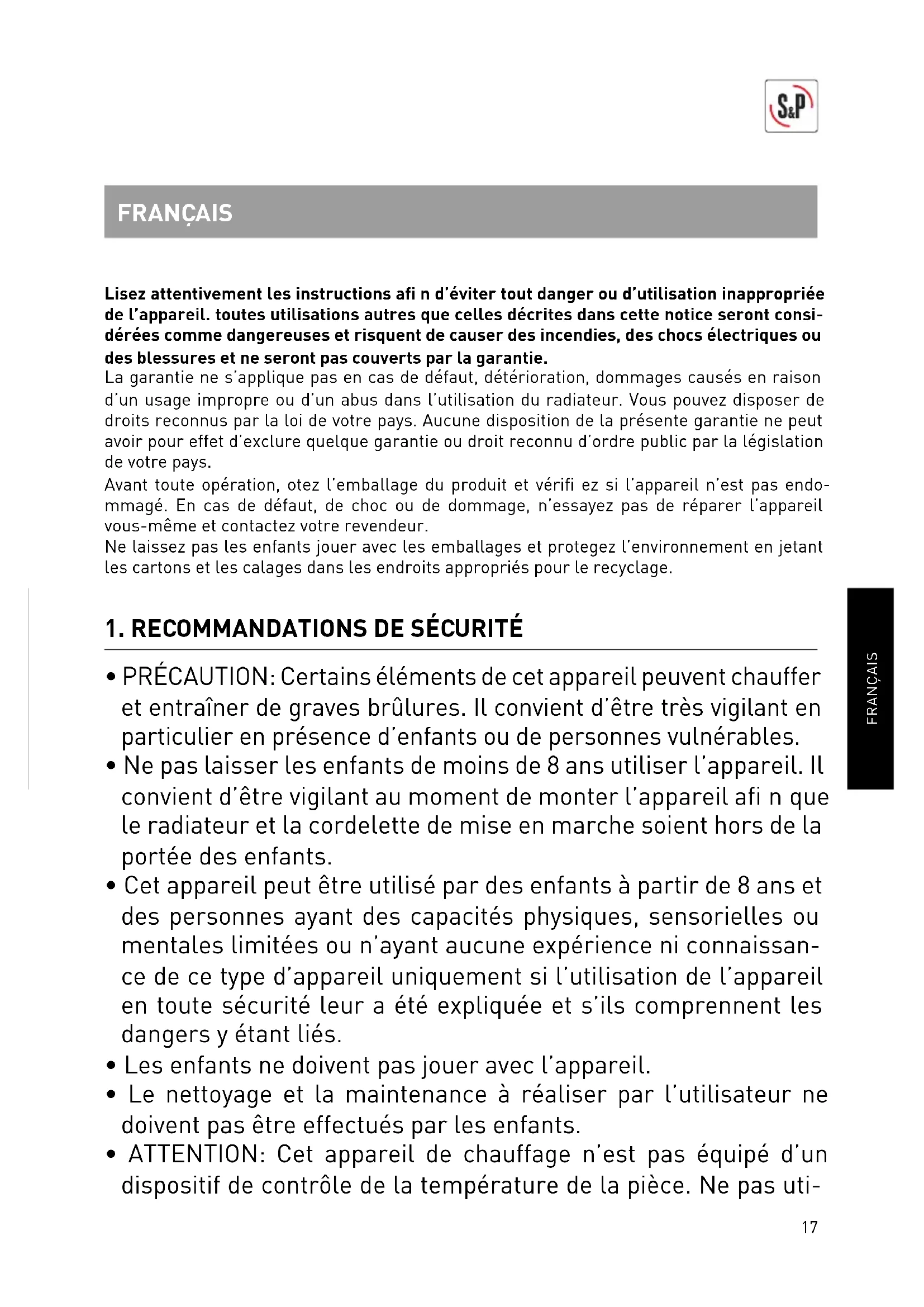 S&P’s large technical Service network will guarantee adequate technical assistance.If a fault is observed in the unit, please contact any of the mentioned technical service offi ces and they will attend to your problem.Any manipulation of the appliance by personnel not belonging to the Offi cial S&P Services will result in your guarantee being void.For any queries regarding S&P products please contact any branch of our After Sales Service network if you are in Spain, or your regular dealer in the rest of the world. To fi nd your nearest dealer, visit your website at www.solerpalau.com17 FRANÇAIS FRANÇAIS Lisez attentivement les instructions afi n d’éviter tout danger ou d’utilisation inappropriée de l’appareil. toutes utilisations autres que celles décrites dans cette notice seront consi- dérées comme dangereuses et risquent de causer des incendies, des chocs électriques ou des blessures et ne seront pas couverts par la garantie. La garantie ne s’applique pas en cas de défaut, détérioration, dommages causés en raison d’un usage impropre ou d’un abus dans l’utilisation du radiateur. Vous pouvez disposer de droits reconnus par la loi de votre pays. Aucune disposition de la présente garantie ne peut avoir pour effet d’exclure quelque garantie ou droit reconnu d’ordre public par la législation de votre pays. Avant toute opération, otez l’emballage du produit et vérifi ez si l’appareil n’est pas endo- mmagé. En cas de défaut, de choc ou de dommage, n’essayez pas de réparer l’appareil vous-même et contactez votre revendeur. Ne laissez pas les enfants jouer avec les emballages et protegez l’environnement en jetant les cartons et les calages dans les endroits appropriés pour le recyclage.