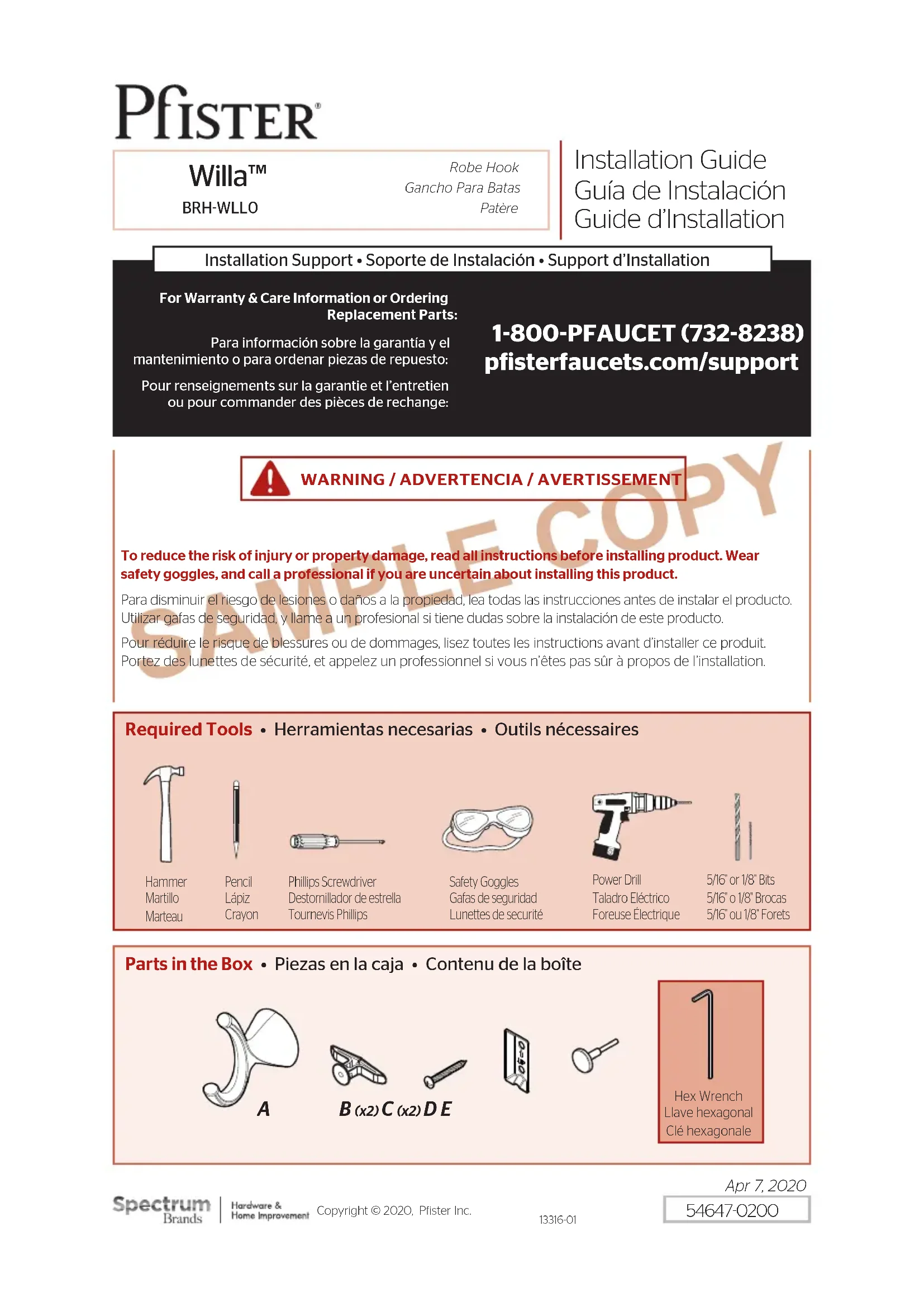 CE SOIT PAR RAPPORT À UN CONTRAT OU PAR VOIE DE NÉGLIGENCE (cela comprend la négligence et la responsabilité stricte). Pister se réserve le droit de discontinuer ou de modiier un produit en tout temps. Certaines provinces ne permettent pas l’exclusion ou la limitation des dommages indirects, de sorte que la limitation exprimée peut ne pas s’appliquer. La présente garantie octroie aux clients certains droits d’ordre juridique, et ceux-ci pourraient en avoir d’autres, selon la province où ils habitent. La garantie ne s’applique pas aux dommages résultant d’un entretien, d’un nettoyage ou d’une installation fautivement eectués, ou encore d’usages fautifs, d’abus, de modiications, d’accidents ou de catastrophes naturelles. English Español Français SAMPLE COPY