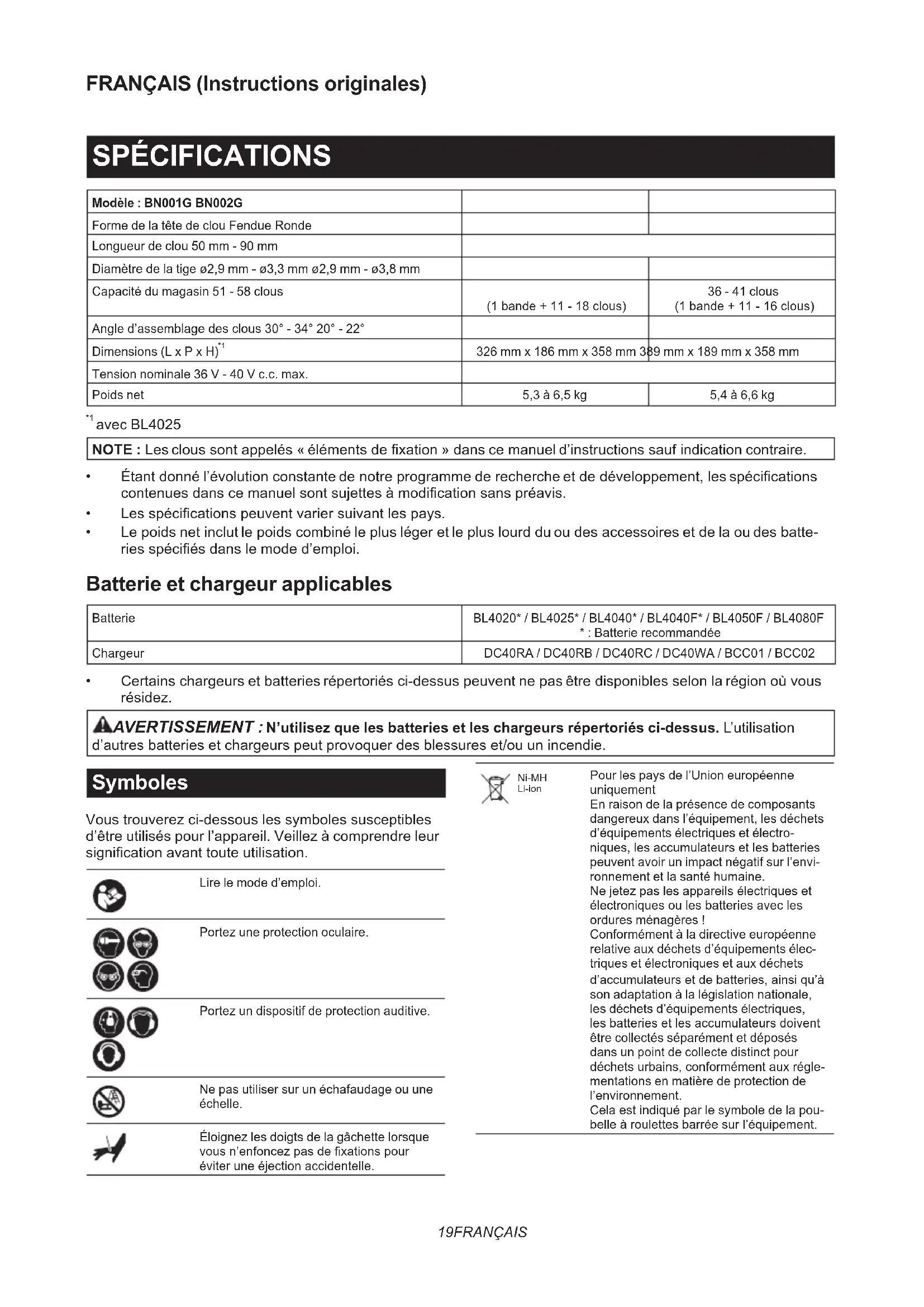 d’autres batteries et chargeurs peut provoquer des blessures et/ou un incendie. Symboles Vous trouverez ci-dessous les symboles susceptibles d’être utilisés pour l’appareil. Veillez à comprendre leur signication avant toute utilisation. Lire le mode d’emploi. Portez une protection oculaire. Portez un dispositif de protection auditive. Ne pas utiliser sur un échafaudage ou une échelle. Éloignez les doigts de la gâchette lorsque vous n’enfoncez pas de xations pour éviter une éjection accidentelle. Ni-MH Li-ion Pour les pays de l’Union européenne uniquement En raison de la présence de composants dangereux dans l’équipement, les déchets d’équipements électriques et électro- niques, les accumulateurs et les batteries peuvent avoir un impact négatif sur l’envi- ronnement et la santé humaine. Ne jetez pas les appareils électriques et électroniques ou les batteries avec les ordures ménagères ! Conformément à la directive européenne relative aux déchets d’équipements élec- triques et électroniques et aux déchets d’accumulateurs et de batteries, ainsi qu’à son adaptation à la législation nationale, les déchets d’équipements électriques, les batteries et les accumulateurs doivent être collectés séparément et déposés dans un point de collecte distinct pour déchets urbains, conformément aux régle- mentations en matière de protection de l’environnement. Cela est indiqué par le symbole de la pou- belle à roulettes barrée sur l’équipement.20 FRANÇAIS Utilisations Cet outil est conçu pour les travaux intérieurs prélimi- naires tels que la xation des solives de plancher et des chevrons, ainsi que pour les travaux de charpente dans les maisons à ossature 2″ x 4″. Bruit Niveau de bruit pondéré A typique, déterminé selon EN60745-2-16 : Modèle BN001G Niveau de pression sonore (L