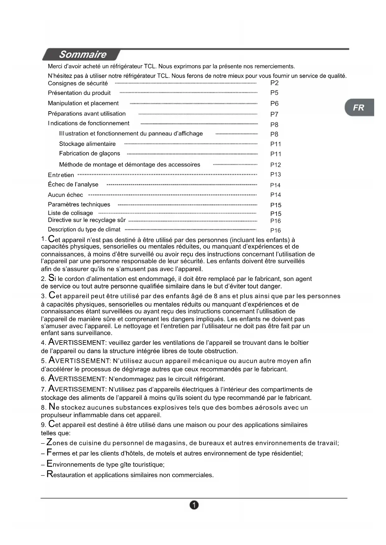 propulseur inflammable dans cet appareil.9. Cet appareil est destiné à être utilisé dans une maison ou pour des applications similairestelles que: – Zones de cuisine du personnel de magasins, de bureaux et autres environnements de travail; – Fermes et par les clients d’hôtels, de motels et autres environnement de type résidentiel;– Environnements de type gîte touristique;– Restauration et applications similaires non commerciales. Sommaire Merci d’avoir acheté un réfrigérateur TCL. Nous exprimons par la présente nos remerciements. N’hésitez pas à utiliser notre réfrigérateur TCL. Nous ferons de notre mieux pour vous fournir un service de qualité. Consignes de sécurité Ill ustration et fonctionnement du panneau d’affichage Stockage alimentaire Fabrication de glaçons Méthode de montage et démontage des accessoires Présentation du produit Manipulation et placement Préparations avant utilisation