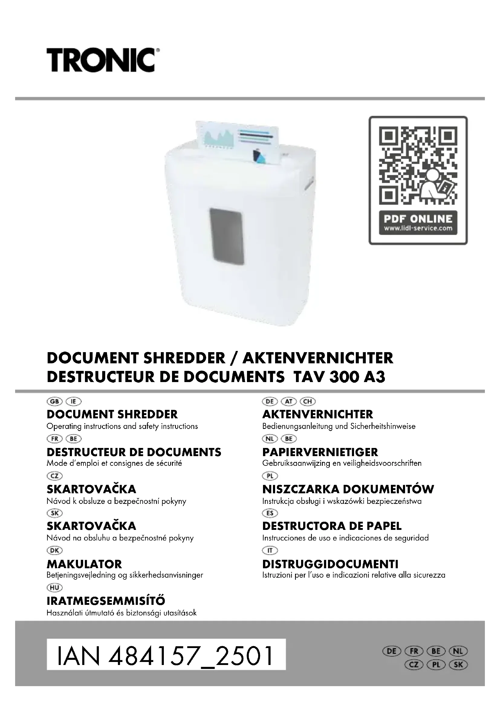 AVERTISSEMENT! RISQUE DE BLESSURE! ■ Ne vous approchez pas de la fente de coupe avec des vêtements amples, des cheveux longs, des bijoux, etc. ■ N’insérez jamais les doigts dans les fentes de coupe. ■ Maintenez les enfants à distance de l’appareil. Ils peuvent en effet se blesser. ■ Le destructeur de documents doit être utilisé par une seule personne à la fois. ■ Ne jamais laisser l’appareil sans surveillance lorsqu’il est en service. ■ N’utilisez pas l’appareil dans des milieux poussiéreux ou des atmosphères explosives (gaz inflammables, vapeurs, vapeurs de solvants organiques). Risque d’explosion! ■ Maintenez les animaux à distance de l’appareil. Ils peuvent en effet se blesser. ■ Cet appareil ne doit pas être utilisé par des personnes (enfants compris) ayant des capacités physiques, mentales et sensorielles réduites ou qui n’ont pas l’expérience et / les connaissances néces- saires, à moins qu’elles ne soient sous la surveillance d’une per- sonne responsable de leur sécurité ou qu’elles aient reçu de cette personne des directives concernant l’utilisation de l’appareil. ■ L’emballage est dangereux pour les enfants. Après le déballage, recyclez l’emballage immédiatement ou rangez-le hors de portée des enfants. ■ Disposez le cordon d’alimentation de telle manière que personne ne puisse marcher ou trébucher dessus. ■ Nettoyez régulièrement la poussière de papier présente sur l’ap- pareil. La poussière de papier peut facilement s’enflammer et peut provoquer une déflagration si la concentration dans l’air est suffi- samment élevée. Il y a risque de blessures! IB_484157_2501_TAV300A3_LB8.indb 32 14.05.2025 13:09:42FR