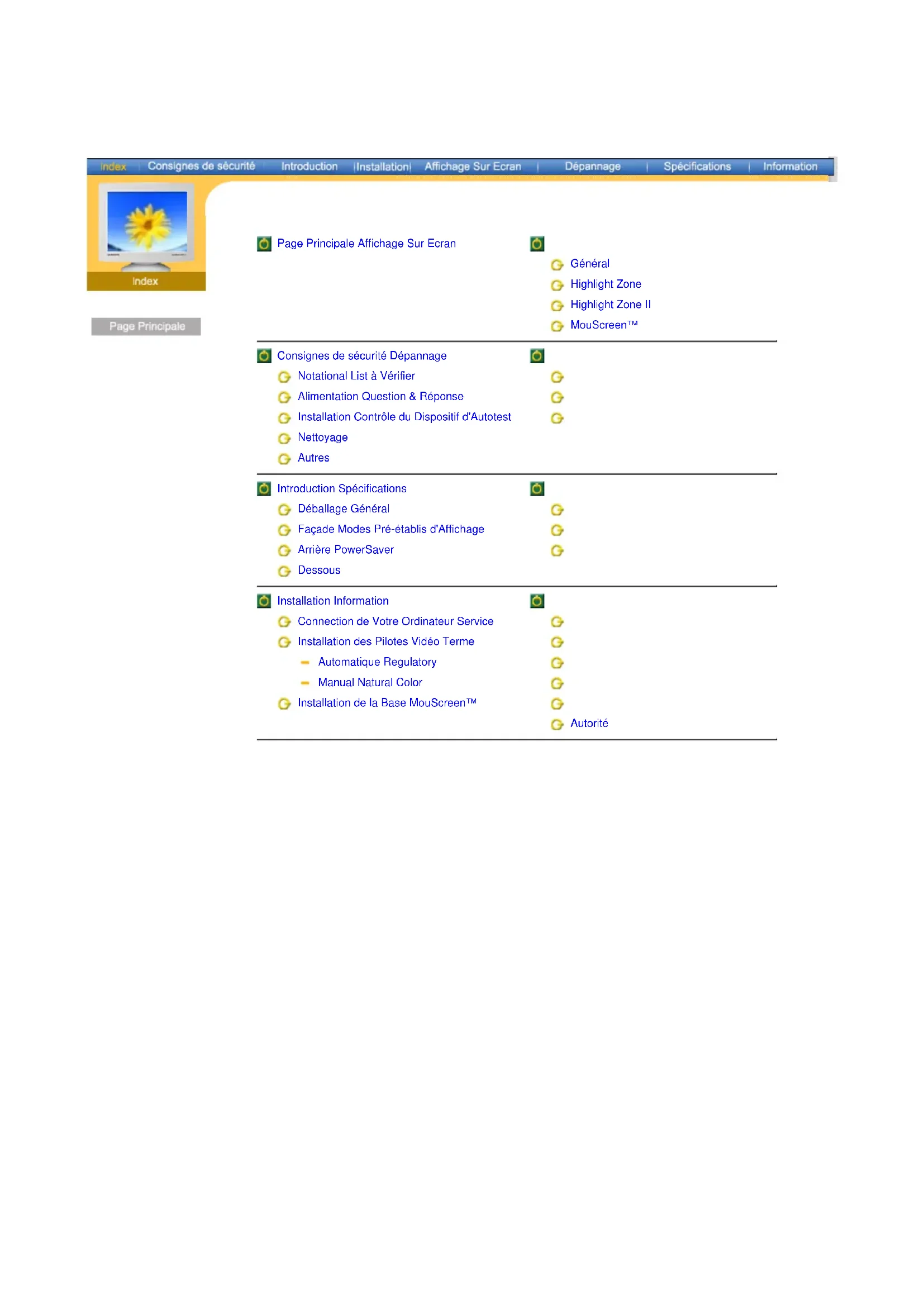 Distance entre deux points L'image de l'écran est composée de points rouges, vert et bleus. Plus les points sont proches, plur la resolution est haute. La distance entre deux points de même couleur est appelé 'Distance entre les Deux Points'. Unité: mm Fréquence Verticale L'écran doit être réaffiché plusieurs fois par seconde afin de créer et afficher l'image pour l'utilisateur. La fréquence de cette répétition par seconde est appelée Fréquence Verticale ou le Taux de RafraÎchissement. Unité: Hz Example: Si le même point lumineux s affiche 60 fois par seconde, il est considéré comme étant à 60 hertz. Dans ce cas-ci, le clignotement sur l'écran peut être détecté. Pour éviter ce problème, vous avez à votre disposition le mode Sans Scintillement avec une fréquence verticale supérieure à 70Hz. Fréquence Horizontale Le temps de balayer une ligne reliant le bord droit au bord gauche horizontale de l'écran s'appelle Cycle Horizontale. Le nombre inverse de Cycle Horizontale est appelé la Fréquence Horizontale. Unité: kHz Entrecroiser et methode de Non-Entrecroiser La methode Entrecroisé consiste à montrer les lignes horizontales de l'écran dans l'ordre de haut en bas. La méthode Non-Entrecroisé est utilisé dans la plupart des moniteurs pour s`assurer une image claire. La méthode Entrecroisé est la même que celle de la télévision. Plug & Play Ceci est une fonction qui apporte la meilleure qualité d'écran pour l'utilisateur en permettant l' échange d'informations automatique entre l'ordinateur et le moniteur. Ce moniteur suit le standard international VESA DDC pour la fonction Plug & Play. Résolution Le nombre de points verticaux et horizontaux constituent l'image d'écran appelée 'résolution'. Ce nombre montre la précision de l'affichage. La haute résolution est excellente pour accomplir des tâches multiples car plus d'informations et d `images peuvent être affichées sur l'écran. Example: Si la résolution est de 1024x768, cela signifie que l'écran est constitué de 1024 points horizontaux (resolution horizontale) et de 768 lignes verticales(résolution verticale). Highlight Zone II La Highlight Zone permet un affichage précis et net de fichiers multimédia animés ou d'images de photographie en améliorant la luminosité de certaines zones de l'écran. Highlight Zone II présente un ensemble de circuits et de logiciels conçus selon la technologie exclusive SEC Cela nous offre une interface simple à utiliser qui met en valeur les parties de lecture vidéo de votre logiciel multimédia en détectant et sélectionnant automatiquement la zone souhaitée par entraînement de l'image. MagicBright™ MagicBright est une nouvelle fonction du moniteur qui offre une qualité d'affichage en matière de luminosité et de clarté deux fois supérieure à celle d'autres moniteurs existants. Cette fonction fournit une luminosité et une résolution d'affichage plus adaptées à la visualisation de texte, d'Internet ou d'animations multimédia pour satisfaire les divers besoins de l'utilisateur. L'utilisateur peut facilement sélectionner l'une des trois options de luminosité et de résolution pré-configurées en appuyant simplement sur l'un des boutons de contrôle de MagicBright qui sont situés à l'avant du moniteur. MouScreen™ S/W MouScreen est un logiciel qui contrôle l'état du moniteur en utilisant les connexions d'USB. Il utilise la souris pour contrôler toutes les fonctions. Vous pouvez choisir des éléments ou des fonctions secondaires en cliquant le bouton gauche de la souris. USB(Universal Serial Bus) USB (Universal Serial Bus) est un connectivité specification d'attacher des périphériques à l'ordinateur et c'est conçu pour répondre au Microsoft Plug et Play specification.Service Terme Regulatory Natural Color MouScreen™ Autorité