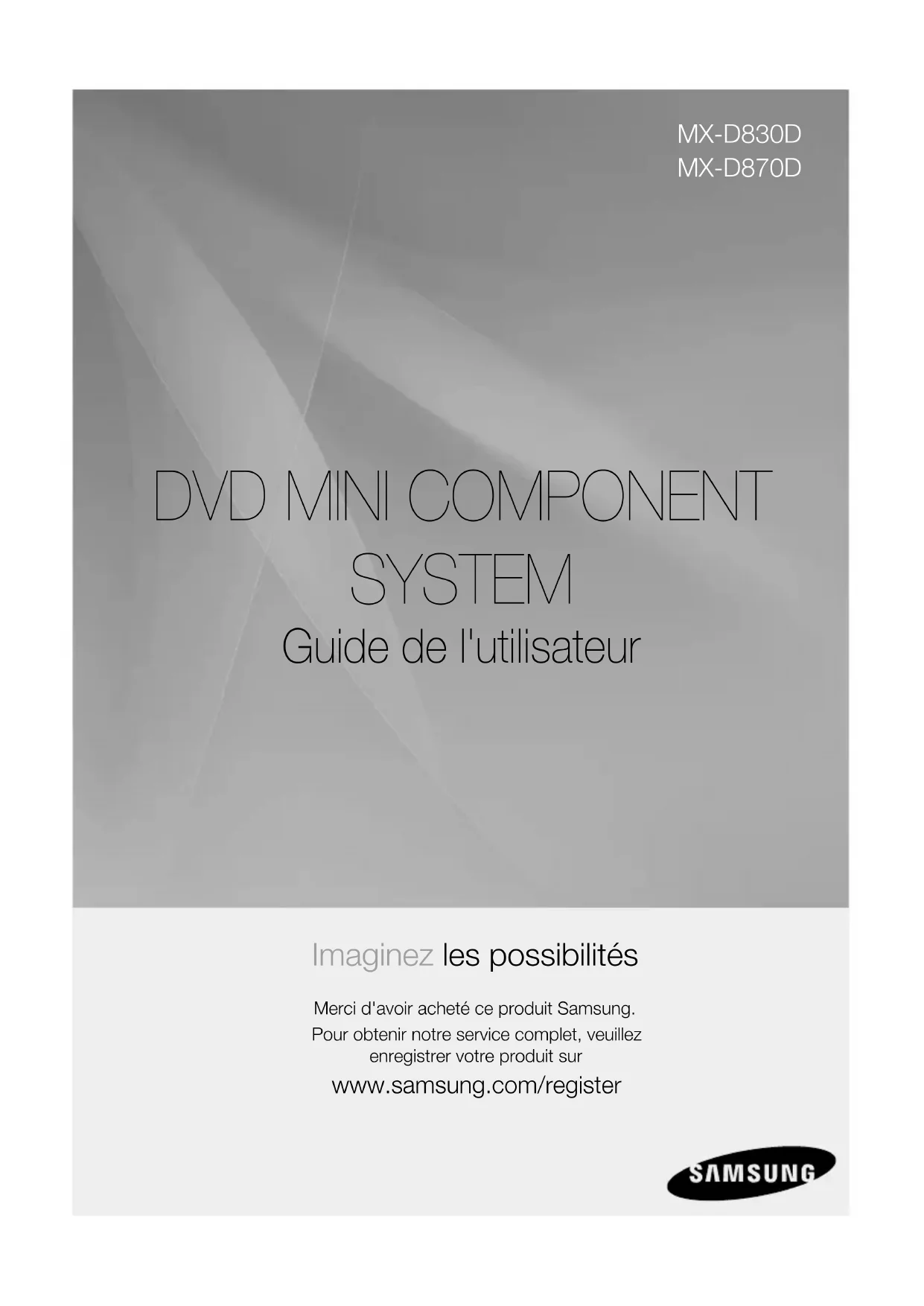SYSTEM Guide de l'utilisateur Imaginez les possibilités Merci d'avoir acheté ce produit Samsung.Pour obtenir notre service complet, veuillez enregistrer votre produit sur www.samsung.com/register MX-D830D MX-D870D2 French French 3 Consignes de sécurité Avertissements de sécuritéPOUR RÉDUIRE LES RISQUES D’ÉLECTROCUTION, NE RETIREZ JAMAIS LE CAPOT (NI L’ARRIÈRE). LES PIÈCES DE CE PRODUIT NE SONT PAS RÉPARABLES PAR L’UTILISATEUR. VEUILLEZ CONTACTER UN TECHNICIEN QUALIFIÉ POUR TOUTE RÉPARATION. ATTENTION RISQUE D’ÉLECTROCUTIONNE PAS OUVRIRCe symbole indique la présence d’une tension dangereuse dans l’appareil, présentant un risque d’électrocution ou de blessures.ATTENTION : AFIN D’ÉVITER TOUT RISQUE D’ÉLECTROCUTION, LA BROCHE LA PLUS LARGE DE LA FICHE DOIT ÊTRE TOTALEMENT INSÉRÉE DANS LE TROU PLUS LARGE.Ce symbole indique les directives importantes qui accompagnent le produit.AVERTISSEMENT Afin de réduire tout risque d’incendie ou •d’électrocution, n’exposez jamais cet appareil à la pluie ou à l’humidité. ATTENTION Évitez toute projection d’eau sur l’appareil et ne posez • jamais d’objet contenant un liquide dessus (ex : un vase). La fiche permet de débrancher l’appareil et doit toujours • être facilement accessible. Cet appareil doit toujours être branché à une prise de • courant alternatif reliée à la terre. Pour débrancher l'appareil, il convient de retirer la fiche de • la prise murale, il faut donc que cette dernière soit facilement accessible.