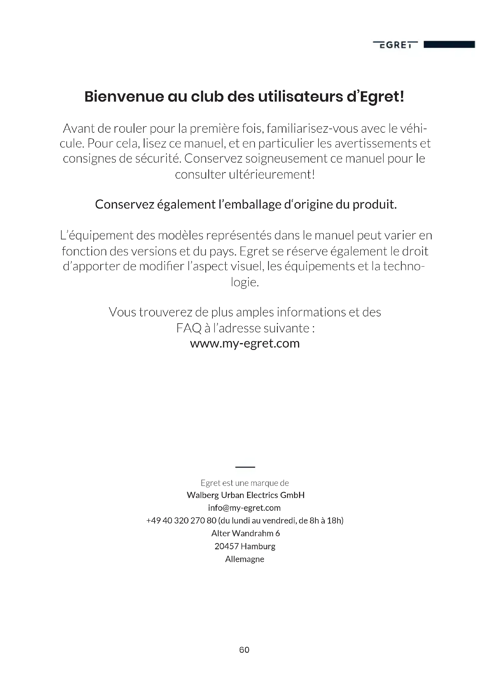 Date, signature, dealer stamp Voluntary service documentation5960 Bienvenue au club des utilisateurs d’Egret! Avant de rouler pour la première fois, familiarisez-vous avec le véhi- cule. Pour cela, lisez ce manuel, et en particulier les avertissements et consignes de sécurité. Conservez soigneusement ce manuel pour le consulter ultérieurement! Conservez également l’emballage d‘origine du produit. L’équipement des modèles représentés dans le manuel peut varier en fonction des versions et du pays. Egret se réserve également le droit d’apporter de modier l’aspect visuel, les équipements et la techno- logie. Vous trouverez de plus amples informations et des FAQ à l’adresse suivante : www.my-egret.com Egret est une marque de Walberg Urban Electrics GmbH info@my-egret.com +49 40 320 270 80 (du lundi au vendredi, de 8h à 18h) Alter Wandrahm 6 20457 Hamburg Allemagne61 DEUTSCH (Originalsprache) 02-28 ENGLISH (Translation) 29-58 FRANCAIS (Traduction) 59-87 Table des matières Contenu de l‘emballage et composants 62 Avant la mise en service 63 Avant le (premier) trajet 64 Avertissements et consignes de sécurité 65-66 Informations générales / Note sur l’environnement 67-68 Instructions de montage 68-69 Fonctionnement 70-85