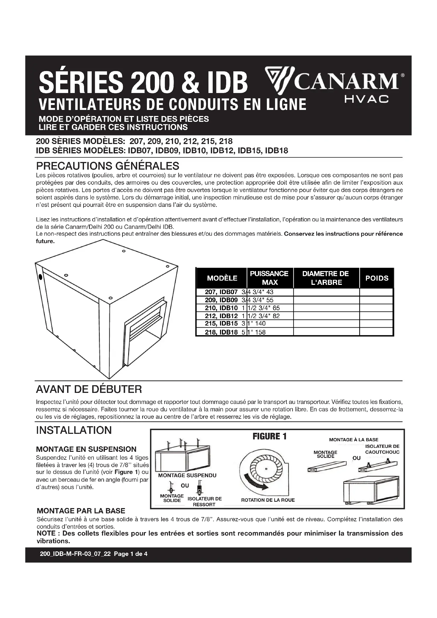 Les pièces rotatives (poulies, arbre et courroies) sur le ventilateur ne doivent pas être exposées. Lorsque ces composantes ne sont pas protégées par des conduits, des armoires ou des couvercles, une protection appropriée doit être utilisée afin de limiter l’exposition aux pièces rotatives. Les portes d’accès ne doivent pas être ouvertes lorsque le ventilateur fonctionne pour éviter que des corps étrangers ne soient aspirés dans le système. Lors du démarrage initial, une inspection minutieuse est de mise pour s’assurer qu’aucun corps étranger n’est présent qui pourrait être en suspension dans l’air du système. Lisez les instructions d’installation et d’opération attentivement avant d’effectuer l’installation, l’opération ou la maintenance des ventilateurs de la série Canarm/Delhi 200 ou Canarm/Delhi IDB. Le non-respect des instructions peut entraîner des blessures et/ou des dommages matériels. Conservez les instructions pour référence future.