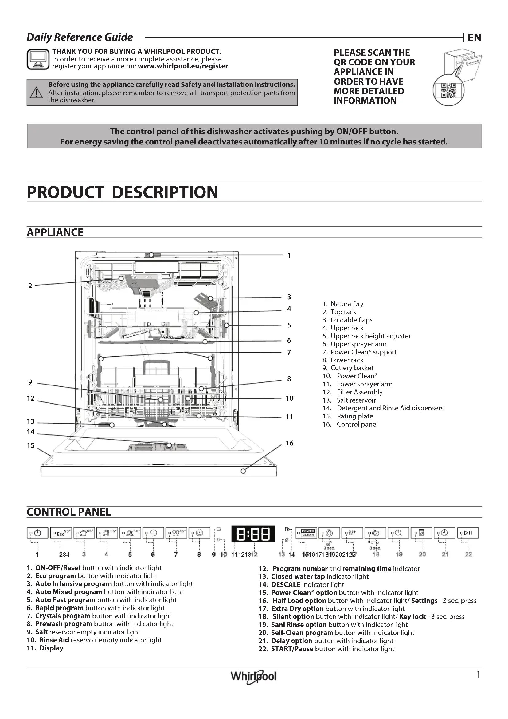 MERCI D’AVOIR CHOISI UN PRODUIT WHIRLPOOL. Afin de recevoir une assistance plus complète, merci d’enregistrer votre appa-reil sur: www.whirlpool.eu/register1. Touche et voyant MARCHE-ARRÊT/Réinitialisation2. Touche et voyant de programme Éco3. Touche et voyant de programme Intensif Auto4. Touche et voyant de programme Mixte Auto5. Touche et voyant de programme Rapide Auto6. Touche et voyant de programme Rapide7. Touche et voyant de programme Cristal8. Touche et voyant de programme Prélavage9. Témoin de réservoir de sel vide10. Témoin de réservoir de liquide de rinçage vide11. Écran12. Indicateur de numéro de programme et de temps restant13. Voyant Robinet d’eau fermé14. Témoin DÉTARTRAGE15. Touche et voyant de l’option Power Clean®16. Touche et voyant d’option Demi-Charge/ Réglages - pression de 3 secondes17. Touche et voyant d’option Extra Sec18. Touche et voyant d’option Silencieux/ Verrouillage des Commandes des touches - pression de 3 secondes19. Touche et voyant d’option Rinçage Antibactérien20. Touche et voyant de programme Autonettoyant21. Touche et voyant d’option Départ Diéré22. Touche et voyant DÉPART/Pause