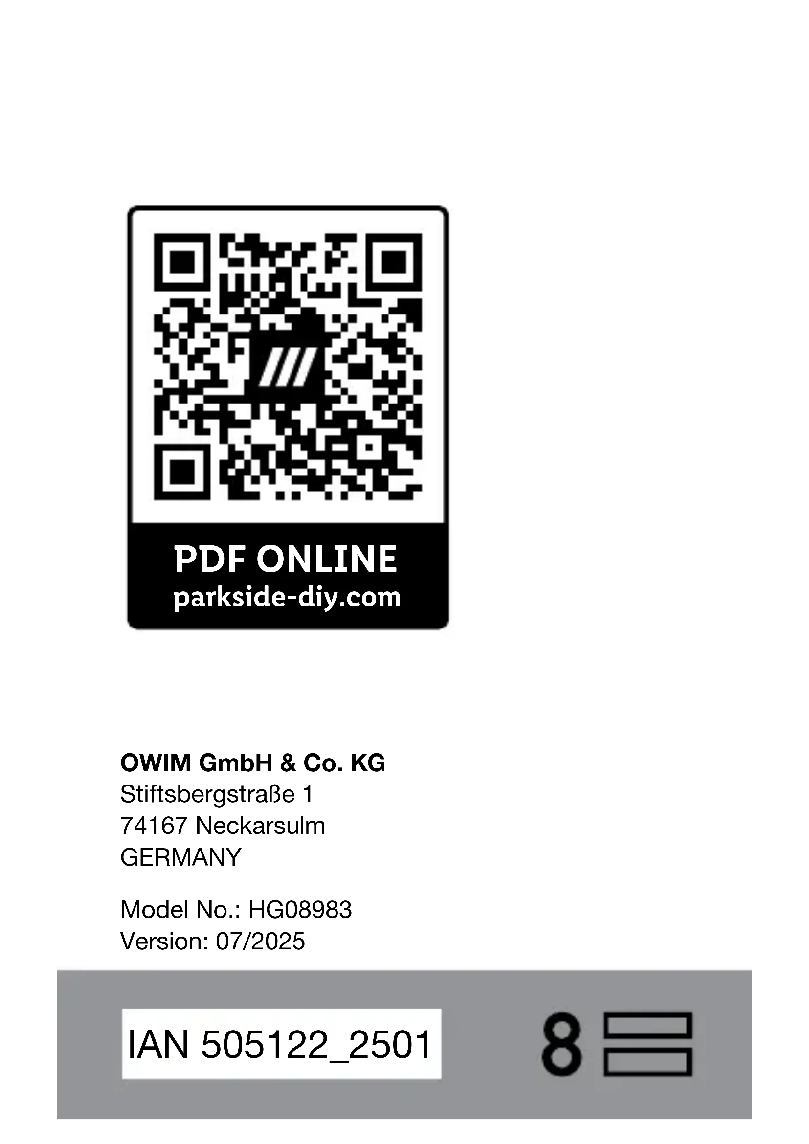 - s‘il présente les qualités qu‘un acheteur peut légitimement attendre eu égard aux déclarations publiques faites par le vendeur, par le producteur ou par son représentant, notamment dans la publicité ou l‘étiquetage ;85FR/BE 2° Ou s‘il présente les caractéristiques dénies d‘un commun accord par les parties ou être propre à tout usage spécial recherché par l‘acheteur, porté à la connaissance du vendeur et que ce dernier a accepté. Article L217-12 du Code de la consommation L‘action résultant du défaut de conformité se prescrit par deux ans à compter de la délivrance du bien. Article 1641 du Code civil Le vendeur est tenu de la garantie à raison des défauts cachés de la chose vendue qui la rendent impropre à l‘usage auquel on la destine, ou qui diminuent tellement cet usage que l‘acheteur ne l‘aurait pas acquise, ou n‘en aurait donné qu‘un moindre prix, s‘il les avait connus.86 FR/BE Article 1648 1er alinéa du Code civil L‘action résultant des vices rédhibitoires doit être intentée par l‘acquéreur dans un délai de deux ans à compter de la découverte du vice. Les pièces détachées indispensables à l’utilisation du produit sont disponibles pendant la durée de la garantie du produit. Le produit a été fabriqué selon des critères de qualité stricts, et contrôlé consciencieusement avant sa livraison. En cas de défaut de matériau ou de fabrication, vous avez des droits légaux vis-à-vis du vendeur du produit. Vos droits légaux ne sont en aucun cas limités par notre garantie mentionnée ci-dessous.87FR/BE La garantie de ce produit est de 3 ans à partir de la date d’achat. La période de garantie commence à la date d’achat. Conservez l’original de la preuve d’achat dans un endroit sûr car ce document est nécessaire pour prouver l’achat. Tout dommage ou défaut déjà présent au moment de l’achat doit être signalé immédiatement après le déballage du produit. Si le produit présente un défaut de matériau ou de fabrication dans les 3 ans qui suivent la date d’achat, nous le réparerons ou le remplacerons - à notre choix - gratuitement pour vous. La période de garantie n’est pas prolongée par une demande de garantie acceptée. Cette mesure s’applique également pour les pièces remplacées et réparées.88 FR/BE Cette garantie est annulée si le produit a été endommagé ou utilisé ou entretenu de manière incorrecte. La garantie couvre les défauts de matériels et de fabrication. Faire valoir sa garantie An de garantir la rapidité de traitement de votre demande, veuillez tenir compte des indications suivantes: Pour toute demande, veuillez conserver le ticket de caisse et le numéro de référence de l’article (par ex. IAN 505122_2501) au titre de preuves d’achat. Le numéro de référence de l’article est indiqué sur la plaque signalétique du produit, sur une gravure présente sur celui-ci, sur la page de couverture de votre manuel (en bas à gauche) ou sur89FR/BE l’autocollant placé sur la face arrière ou inférieure du produit. En cas de dysfonctionnement de l’appareil ou de tout autre défaut, contactez en premier lieu le service après- vente par téléphone ou par e-mail aux coordonnées indiquées ci-dessous. Tout produit considéré comme défectueux peut alors être envoyé sans frais de port supplémentaires au service clientèle indiqué, accompagné de la preuve d’achat (ticket de caisse) et d’une description écrite du défaut mentionnant également sa date d’apparition. Le site parkside-diy.com vous permet de visualiser et de télécharger ce mode d’emploi ainsi que de nombreux autres manuels. Ce code QR vous permet d’accéder directement au site parkside- diy.com. Sélectionnez votre pays et90 FR/BE cherchez les modes d’emploi dans le champ de recherche. La numéro de référence de l’article (IAN) 505122_2501 vous permet d’accéder au mode d’emploi se rapportant à votre article. PDF ONLINE parkside-diy.com91FR/BE Service après-vente Service après-vente France Tél.: 0800904879 E-Mail: owim@lidl.fr Service après-vente Belgique Tél.: 080071011 Tél.: 80023970 (Luxembourg) E-Mail: owim@lidl.be92 NL/BE Gebruikte waarschuwingen en symbolen ............. Pagina 94 Inleiding................. Pagina 96 Beoogd gebruik ........ Pagina 97 Levering .............. Pagina 97 Beschrijving onderdelen .. Pagina 97 Technische gegevens .... Pagina 98 Veiligheidsaan wijzingen.... Pagina 100 Bediening ............... Pagina 105 Accu opladen .......... Pagina 105 Ladingsniveau.......... Pagina 106 Wandmontage ......... Pagina 10793NL/BE Schoonmaken en onderhoud Pagina 108 Afvoer .................. Pagina 110 Vereenvoudigde EU- conformiteitsverklaring .... Pagina 113 Garantie................. Pagina 114 Afwikkeling in geval van garantie............... Pagina 116 Service ............... Pagina 11894 NL/BE Gebruikte waarschuwingen en symbolen In deze gebruiksaanwijzing, op de verpakking en op het typeplaatje worden de volgende waarschuwingen gebruikt: Lees de gebruiksaanwijzing. Houdt u zich aan de waarschuwings- en veiligheidsinstructies! Wisselstroom/-spanning95NL/BE Gelijkstroom/-spanning Beschermingsklasse II (dubbele isolering) Gebruik het product alleen in droge binnenruimtes. T3.15A Beveiliging Dit symbool met de aanduiding “Info” duidt op verdere nuttige informatie. Veiligheidsvoorschriften en extra informatie Handelingsaanwijzingen96 NL/BE