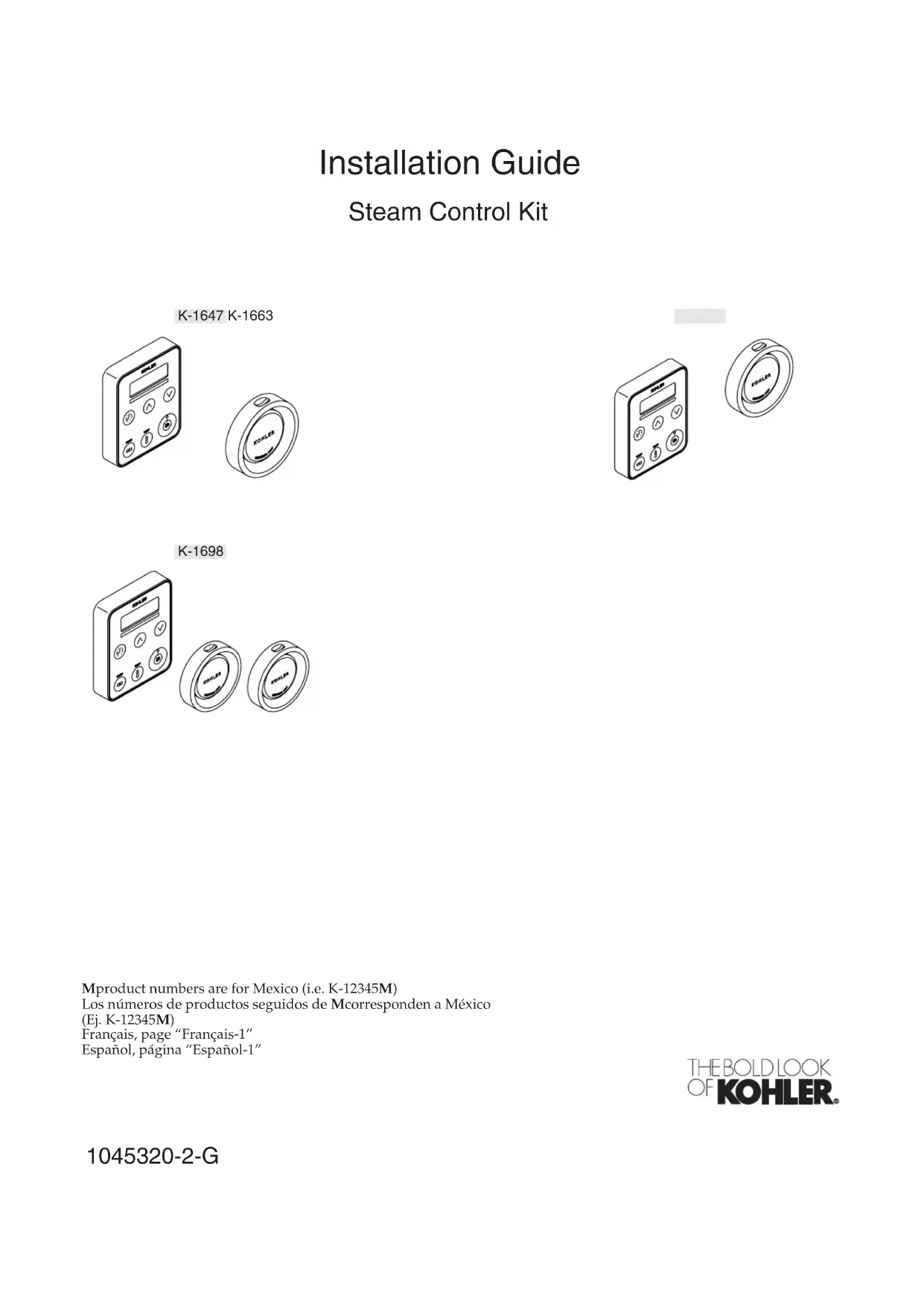 sans surveillance à tout moment. Le générateur de vapeur n’est pas conçu pour les enfants. AVIS: N’utiliser cette unité que pour l’usage destiné tel qu’indiqué dans ce manuel. NE PAS utiliser des dispositifs de fixation non recommandés par la Kohler Co. Mastic d'étanchéité â la silicone Percer un trou avec une mèche de 1-1/4" & 2-1/2" (faire correspondre la mèche au matériau du mur) Ruban d'étanchéité Clé à douilles avec 1douille Mamelons de tuyau Kohler Co. Français-1 1045320-2-GAvant de commencer (cont.) Inspecter le produit pour s’assurer de l’absence de tout dommage. Contacter le service d’assistance à la clientèle de KOHLER en utilisant l’information fournie à l’arrière de ce guide. Respecter tous les codes de plomberie et électriques locaux. Tout le travail électrique doit être réalisé par un électricien qualifié. Débrancher avant d’effectuer toute connexion électrique. Kohler Co. se réserve le droit d’apporter toutes modifications sur le design des produits et ceci sans préavis, tel que spécifié dans le catalogue des prix. 1045320-2-G Français-2 Kohler Co.Examiner la disposition