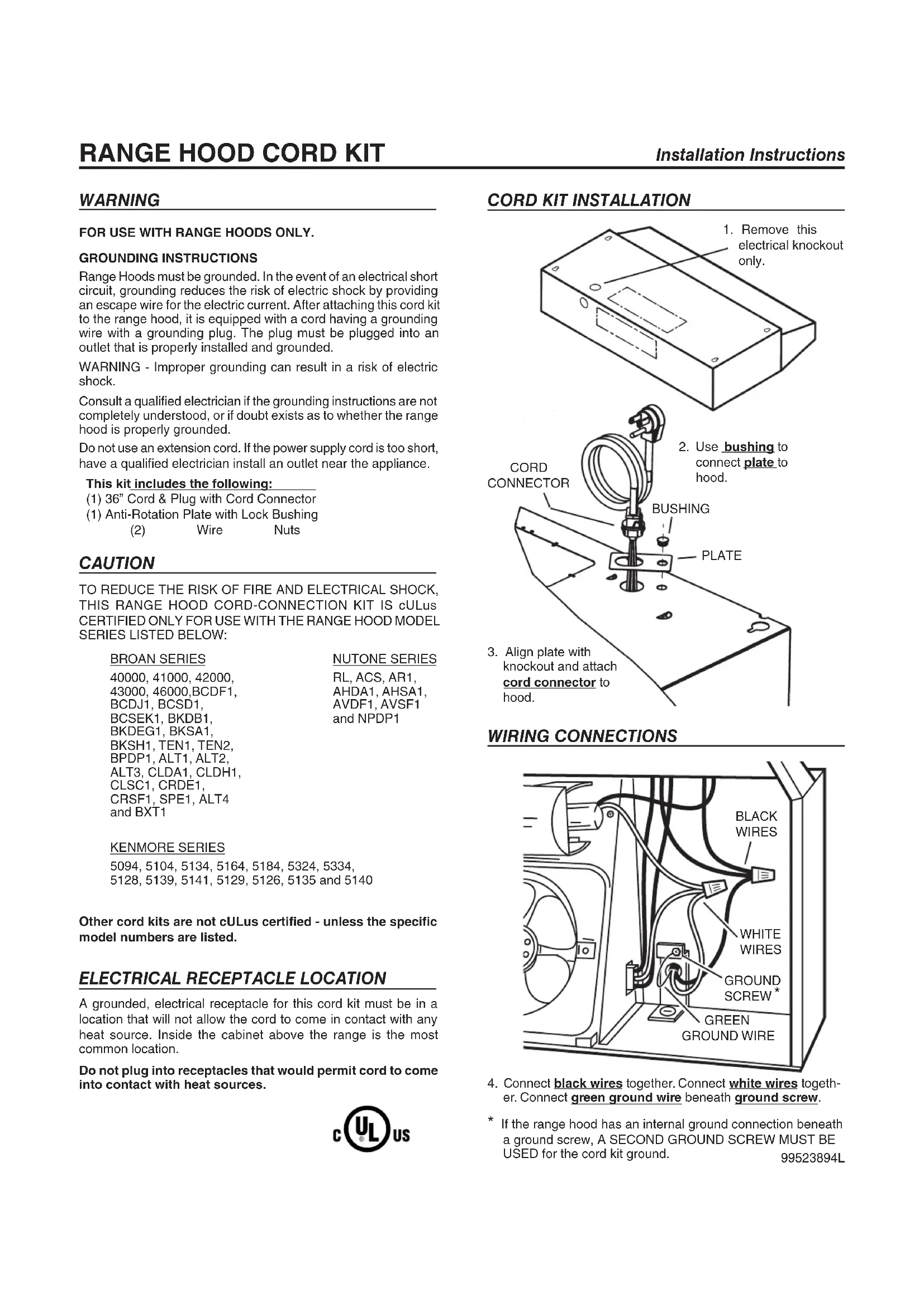 Cet appareil doit comporter une mise à la terre. Dans l’éventualité d’un court-circuit, la mise à la terre réduit les risques de choc électrique en évacuant le courant dans un fil. Cette appareil est muni d’un cordon électrique avec fil de terre pour une prise de courant comportant une mise à la terre. La fiche doit être branchée dans une prise correctement installée et mise à la terre. AVERTISSEMENT – Une mise à la terre inadéquate peut provoquer un choc électrique. Consultez un électricien qualifié si vous ne comprenez pas parfaitement les instructions de mise à la terre, ou si vous ignorez si la prise de courant est correctement mise à la terre. N’utilisez pas une rallonge. Si le cordon électrique est trop court, demandez à un électricien qualifié d’installer une prise à proximité de l’appareil. Cet ensemble comprend ce qui suit: (1) Câble de 36 po & fiche avec connecteur du cordon (1) Plaque anti-rotation avec bague de verrouillage (2) Capuchons de connexion ATTENTION POUR RÉDUIRE LES RISQUES DE FEU ET DE CHOC ÉLECTRIQUE, N’UTILISEZ CE CORDON DE CONNEXION POUR HOTTES DE CUISINE QU’AVEC LES SÉRIES DE MODÈLES CI-DESSOUS :