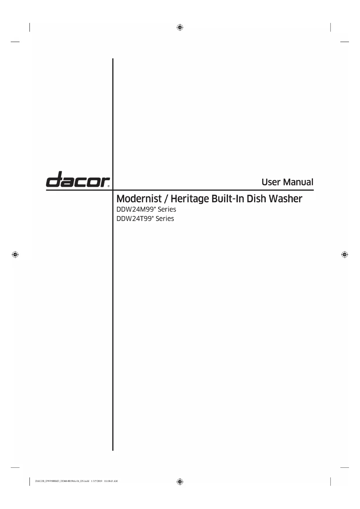Protection de l'environnement 47 Caractéristiques techniques 47 Garantie et assistance 48 Obtenir de l'aide 48 Garantie 48 DACOR_DW9500MD_DD68-00196A-04_CFR.indd 3 3/7/2019 11:19:23 AMFrançais4 Chers clients, Vous venez d'acheter l'un des produits Dacor® les plus récents et nous vous en félicitons ! Notre gamme The Life of the Kitchen™ est une combinaison unique de fonctionnalités, de styles et de performances qui apporte une réelle valeur ajoutée à votre intérieur. An de prendre connaissances des commandes, des fonctions et de tout le potentiel de votre nouvel appareil distinctif, lisez attentivement ce manuel d'utilisation et d'entretien, en commençant par la section Consignes de sécurité. Tous les appareils Dacor sont conçus et fabriqués avec qualité et erté dans le respect de nos valeurs d'entreprise. Si vous rencontrez un problème avec votre appareil, veuillez d'abord consulter la section Dépannage de ce manuel pour obtenir des conseils. Il vous donnera des suggestions et des solutions avant de contacter le service d'assistance. Nos clients nous aident à améliorer nos produits et nos services de façon continue. N'hésitez pas à contacter notre équipe du service client pour obtenir de l'aide en cas de besoin. Équipe du service client Dacor 14425 Clark Avenue City of Industry, CA 91745 Téléphone : (800) 793-0093 Fax : (626) 403-3130 Horaires d'ouverture : du lundi au vendredi, de 06 h 00 à 17 h 00 (heure du Pacique) Site web : www.Dacor.com Merci d'avoir choisi Dacor pour votre foyer. Nous sommes une entreprise créée par des familles pour des familles et nous nous mettons au service de la vôtre. Nous sommes convaincus que votre nouveau produit Dacor vous apportera plaisir et hautes performances pendant de nombreuses années. Sincères salutations, DACOR_DW9500MD_DD68-00196A-04_CFR.indd 4 3/7/2019 11:19:24 AMConsignes de sécurité Français 5