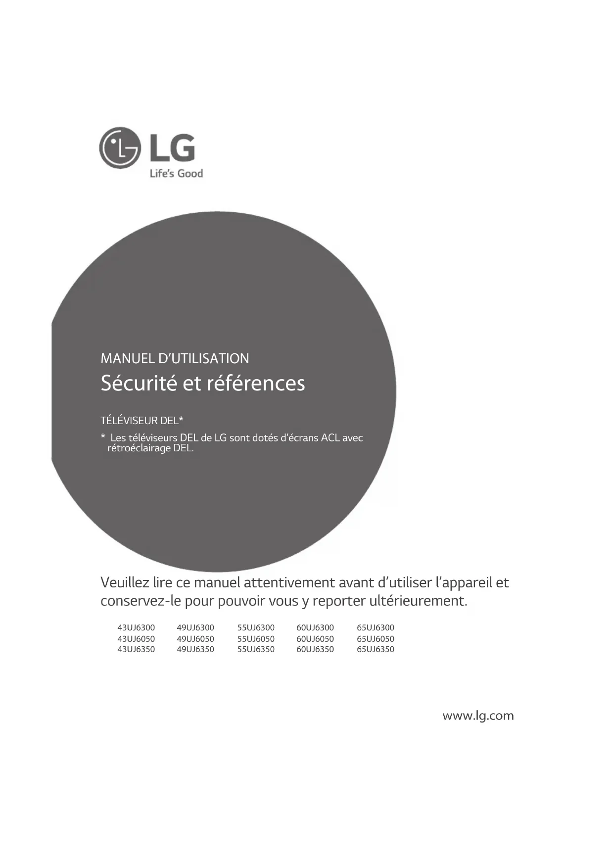 - Les téléviseurs DEL de LG sont dotés d’écrans ACL avec rétroéclairage DEL. www.lg.com Veuillez lire ce manuel attentivement avant d’utiliser l’appareil et conservez-le pour pouvoir vous y reporter ultérieurement. 43UJ630043UJ605043UJ635049UJ630049UJ605049UJ635055UJ630055UJ605055UJ635060UJ630060UJ605060UJ635065UJ630065UJ605065UJ63502 FRANÇAIS AVERTISSEMENT! Directives de sécurité importantes Lisez ces directives. Conservez ces directives. Soyez attentif à tous les avertissements. Suivez toutes les directives.